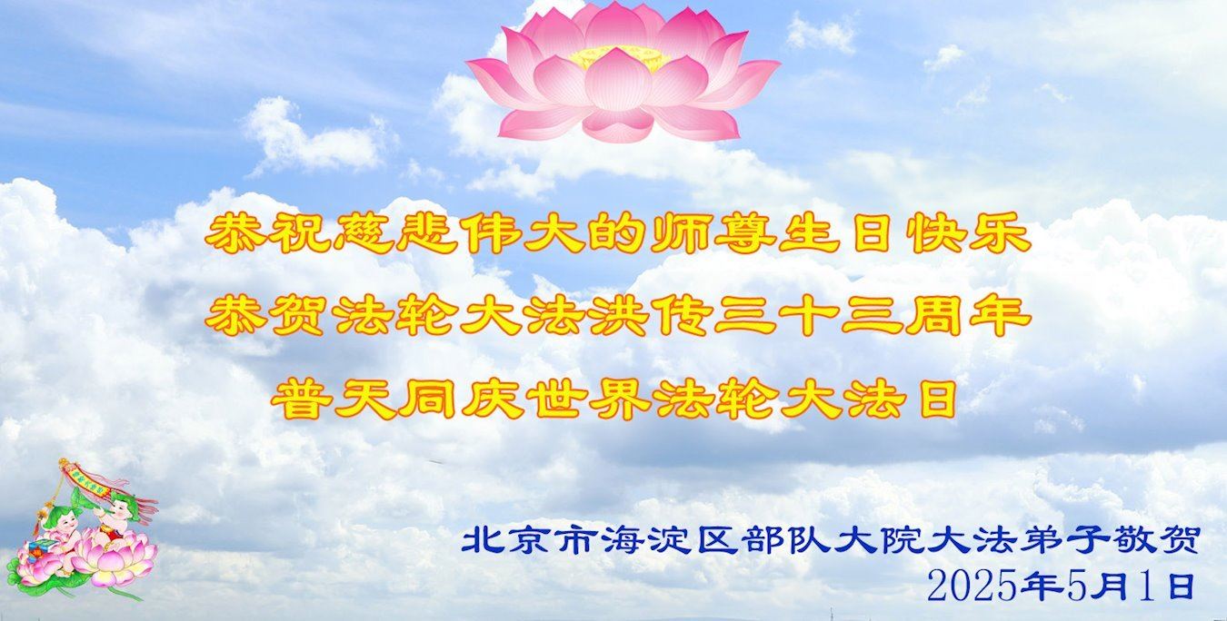 Praktikanti iz zračne baze u Pekingu su napisali: „Na dan kada svi slave Falun Dafa, iskreno želimo Učitelju sretan rođendan. Uprkos progonu od strane Komunističke partije Kine, čvrsto vjerujemo u Učitelja i Fa i dobro ćemo činiti tri stvari kako bismo spasili više ljudi. Učitelju, uvjeravamo vas u to.“