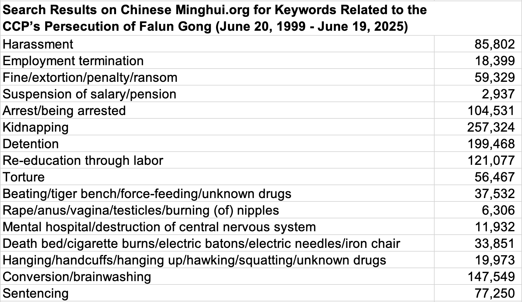 Kao rezultat kontinuiranih zločina i laži KPK, mnogi praktikanti su bili maltretirani, hapšeni i mučeni. Kako bi čitaocima pružili sažet uvid u progon, nedavno su izvršena pretraživanja uz pomoć ključnih riječi za period između 20. juna 1999. i 19. juna 2025. godine, navedenih u nastavku na kineskoj verziji Minghui.org (koja ima potpuniju pokrivenost od verzija na drugim jezicima).