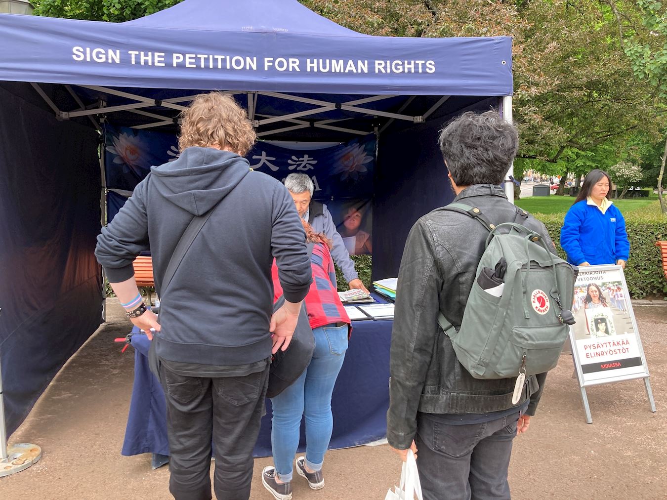 Jedan praktikant je rekao: „Finska je veoma bezbedna. Ali u Kini su životi mnogih praktikanata u opasnosti. Praktikanti van Kine učestvuju u aktivnostima kako bi ljudi saznali za progon, u cilju zaustavljanja zlih dela KPK.“ Kada je čuo da praktikanti prikupljaju potpise više od 20 godina, primetio je: „To je veoma dugo!“