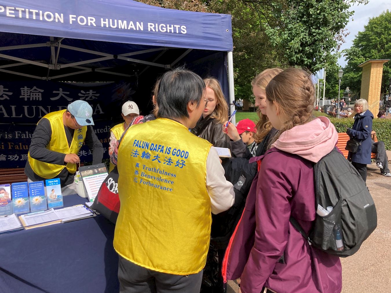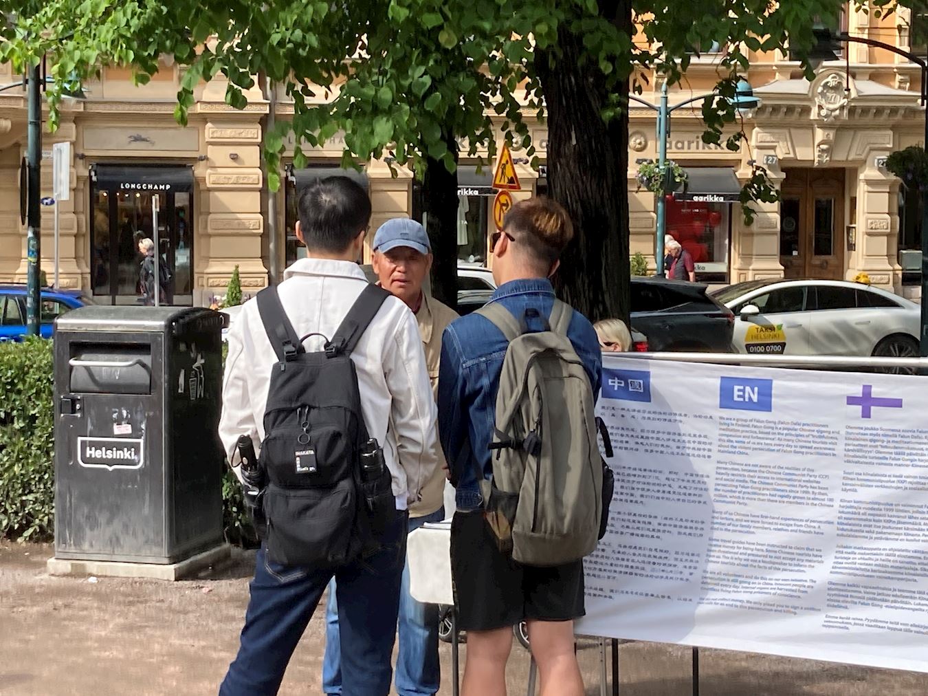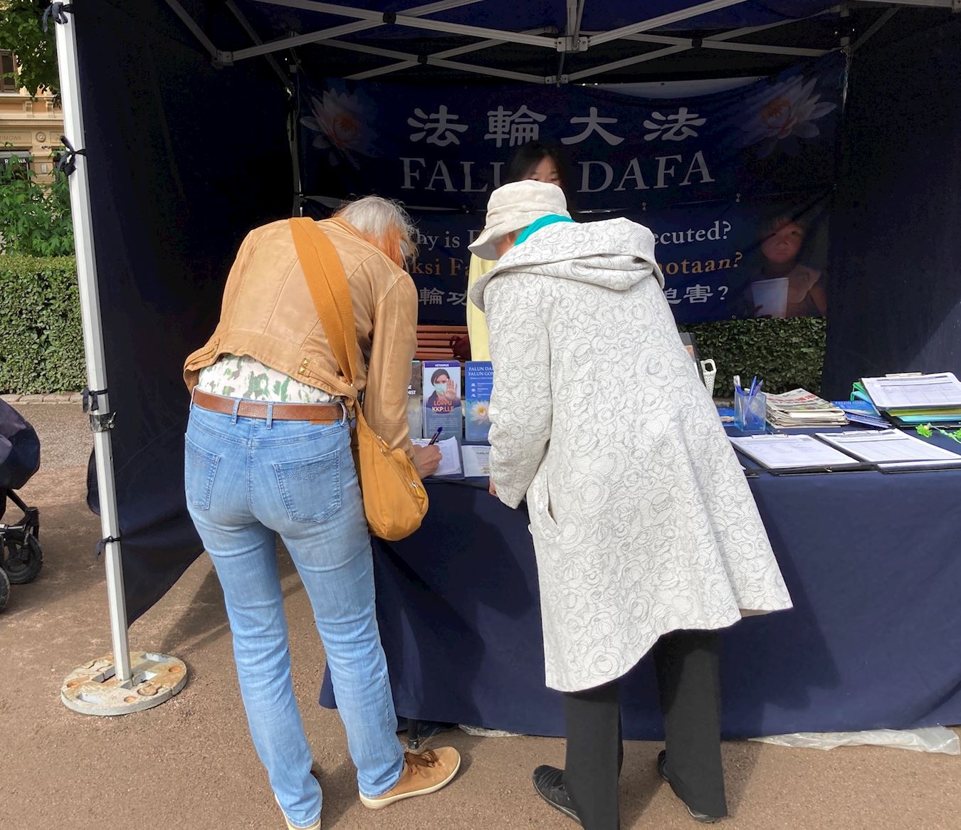 Jedna penzionerka iz Finske rekla je praktikantima: „Znam za vašu praksu, koja naglašava poboljšanje u razmišljanju. Ovo nije religija, ali vas KPK progoni u Kini. To mi je neverovatno.“ Jedan praktikant je objasnio da Falun Dafa naglašava Istinitost-Blagost-Trpeljivost. Žena je rekla: „Kina je totalitarna zemlja, ali sloboda se ne bi smela uskraćivati. Verujem da svako ima pravo da izabere svoj put.“ Izrazila je zahvalnost na prilici da sazna više.