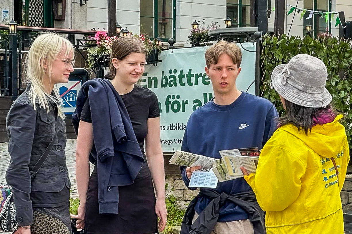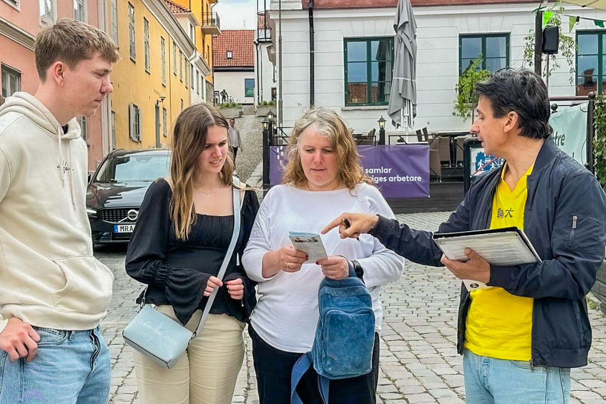 Porodica od troje (majka i njene ćerke) iz Linčepinga dugo se zadržala kod štanda. Majka je rekla praktikantima da su došle ovde da razgovaraju sa praktikantima i izraze svoju zahvalnost. Objasnila je da su tri godine dobijale informacije o predstavama Shen Yuna u Linčepingu, i da je porodica konačno videla predstavu ovog proleća. Majka je rekla da je to bila najlepša i najbolja predstava koju su ikada videli. Bila je ganuta do suza dok je govorila i izražavala svoju zahvalnost za Falun Gong i Shen Yun. Porodica od troje je bila ganuta upornim naporima praktikanata u razjašnjavanju istine i dugo su razgovarali sa praktikantima.