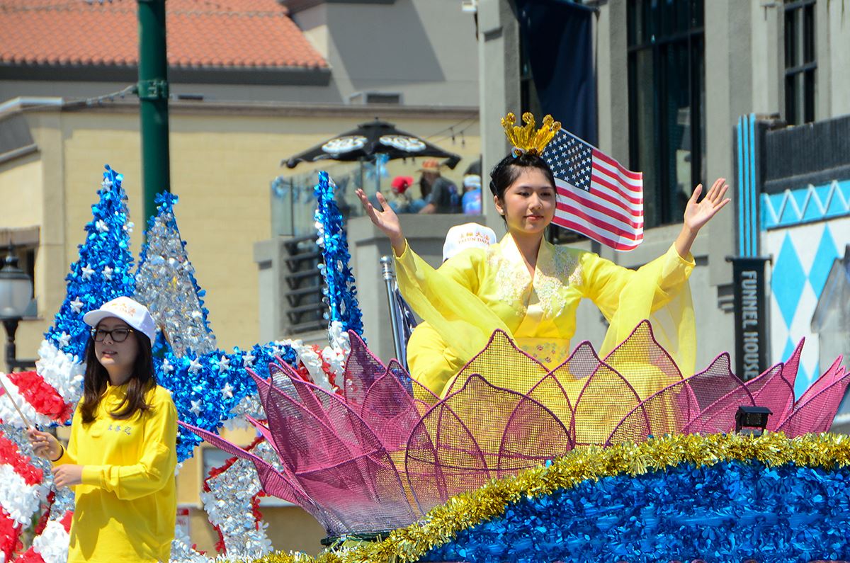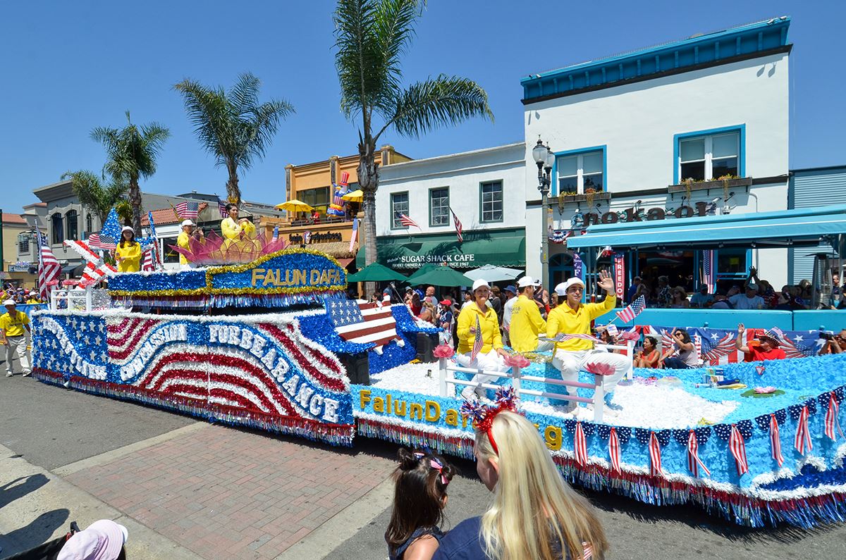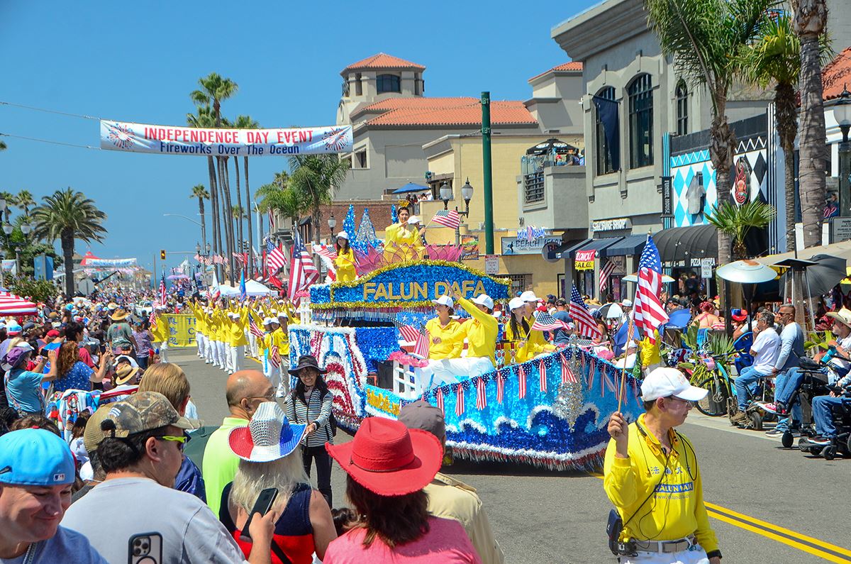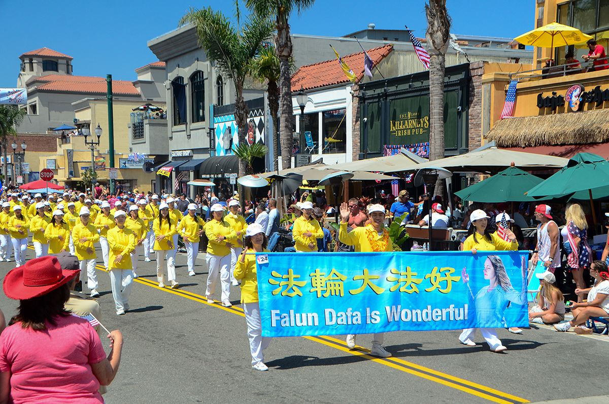 Da bi proslavio 249. Dan nezavisnosti zemlje, Hantington Bič je održao svoju 121. paradu povodom 4. jula. Praktikanti Falun Dafe činili su najveću grupu na paradi. Predvođena Marširajućim orkestrom Tjen Guo, njihova formacija je uključivala platformu ukrašenu crvenom, belom i plavom bojom, sa praktikantkinjom obučenom kao nebeska devica, praćenu kontingentom praktikanata koji su demonstrirali vežbe.