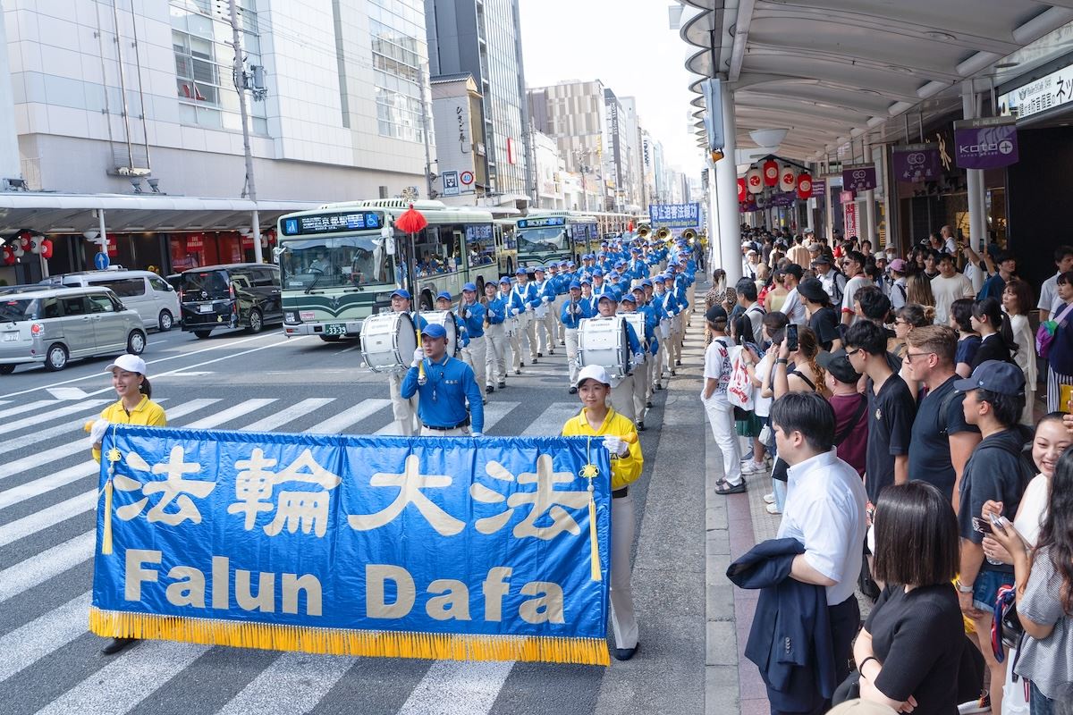 Praktikanti Falun Dafa održali su marš u gradu Kyotu 12. srpnja 2025. kako bi obilježili godišnjicu svog mirnog prosvjeda protiv progona koji sprovodi Komunistička partija Kine (KPK) od 20. srpnja 1999., i kako bi pozvali na njegov prekid.