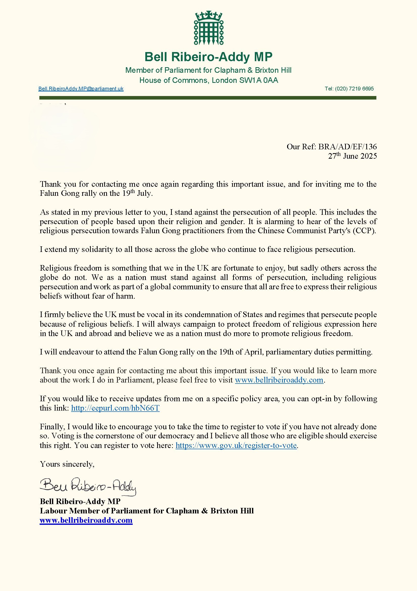 Bel Ribeiro-Adi je u svom pismu navela: „Alarmantno je čuti o nivoima verskog progona praktikanata Falun Gonga od strane Komunističke partije Kine (KPK). Izražavam svoju solidarnost sa svima širom sveta koji se i dalje suočavaju sa verskim progonom.