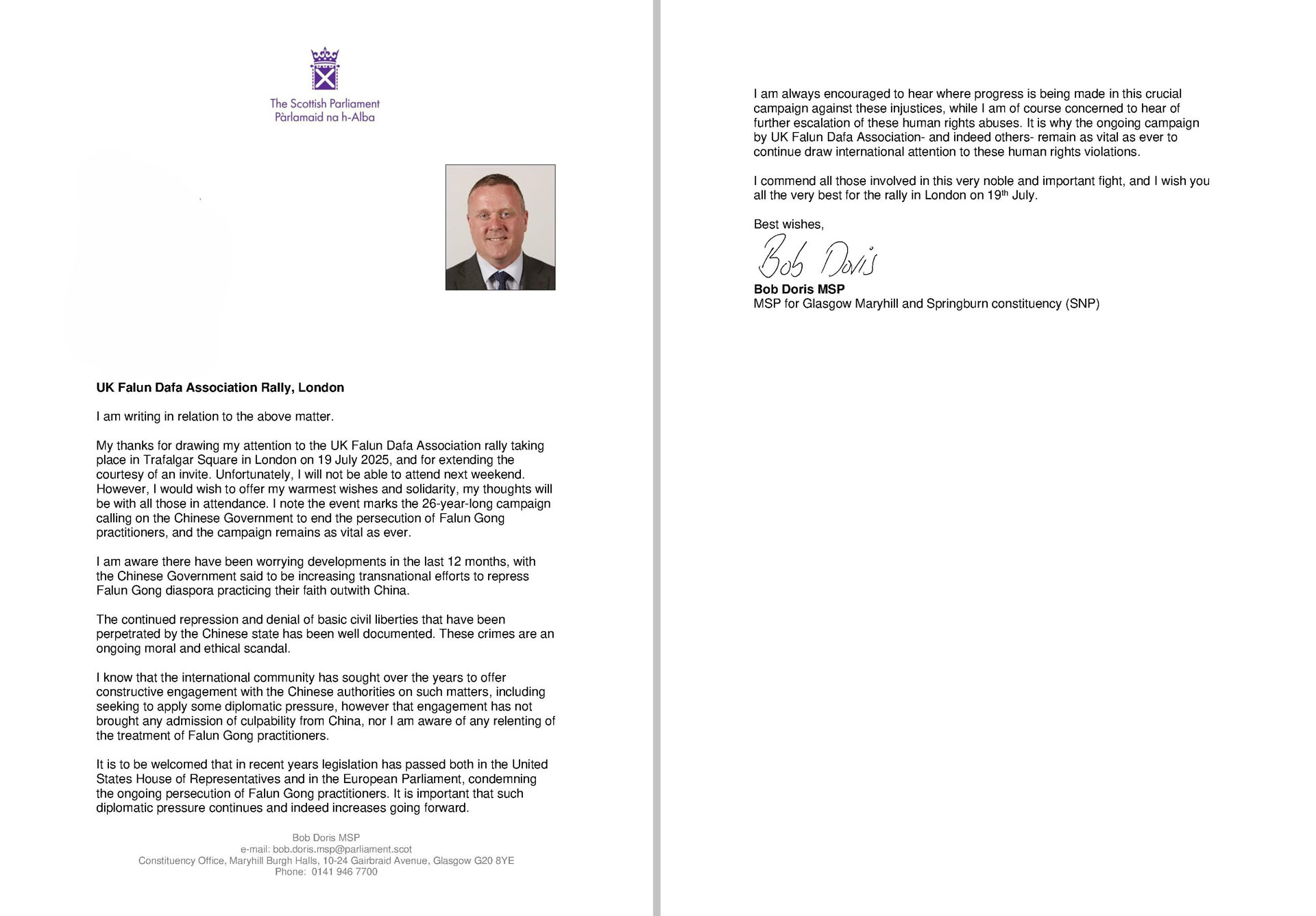 Bob Doris, poslanik u parlamentu, napisao je: „Svestan sam zabrinjavajućih događaja u poslednjih 12 meseci, a kineska vlada, kako se navodi, povećava transnacionalne napore u suzbijanju dijaspore Falun Gong vernika koji praktikuju svoju veru van Kine.