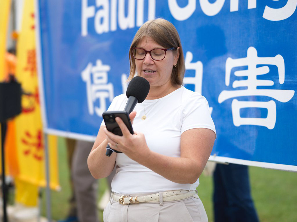 Tokom mitinga, praktikantkinja Falun Gonga, Fu, opisala je svoje iskustvo i istakla da se progon od strane KPK proteže i u inostranstvo.