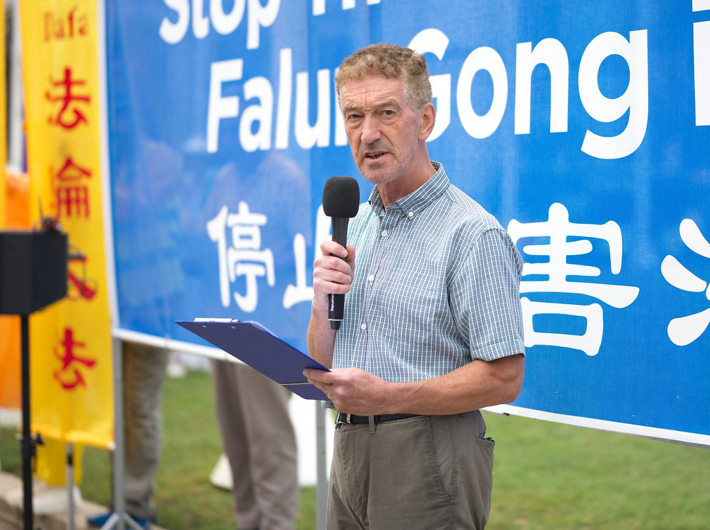 Džon Di, predsednik Evropskih prijatelja Falun Gonga, govorio je na skupu.
