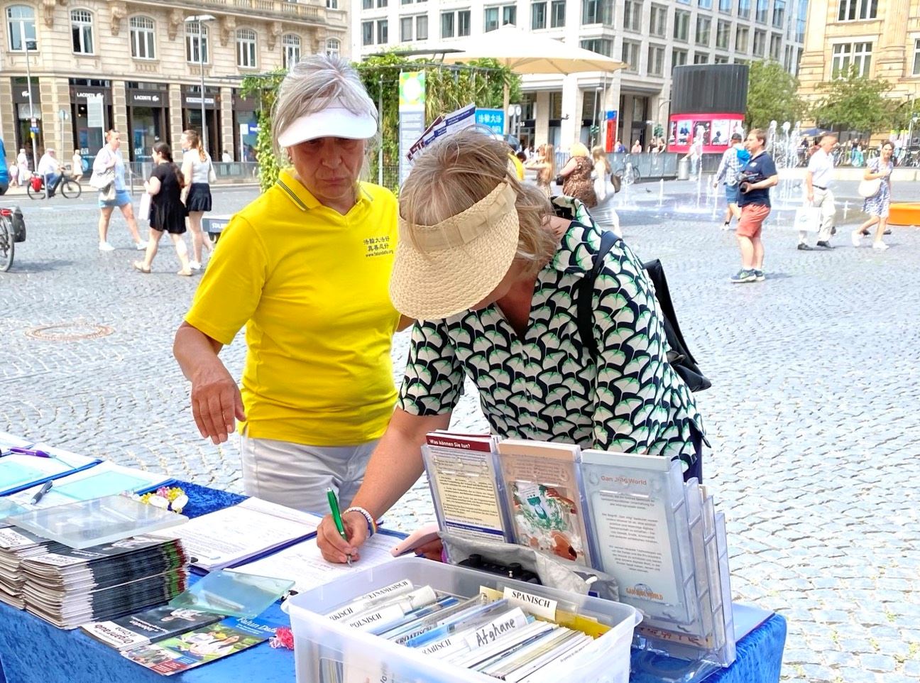 Praktikanti Falun Gonga iz Frankfurta i okolnih područja privukli su pažnju prolaznika na Geteplacu u centru grada. Neki su zastali da gledaju demonstraciju vežbi praktikanata, dok su drugi slušali govore na skupu ili razgovarali sa praktikantima. Želeli su da saznaju šta je Falun Gong, zašto ga KPK progoni i kako da pomognu praktikantima da okončaju progon. Neki ljudi su potpisali peticiju kojom se poziva na okončanje progona.