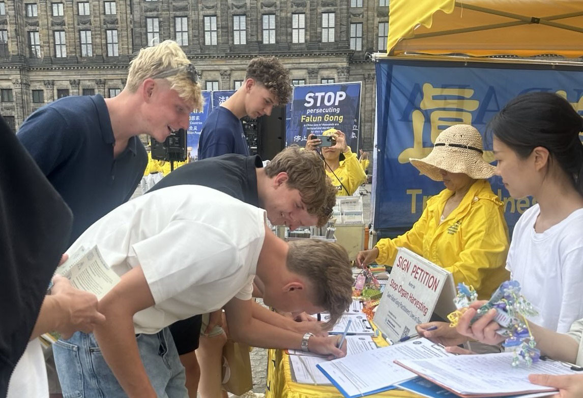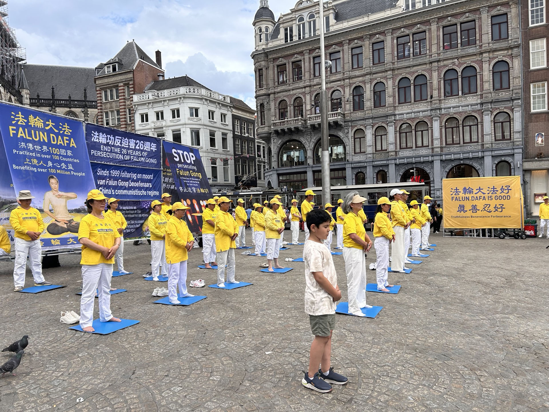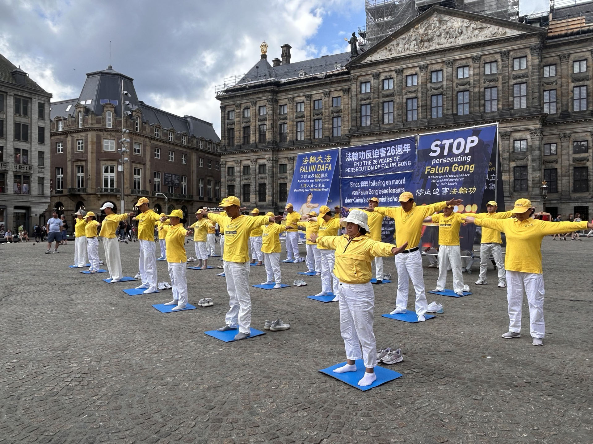 Falun Gong praktikanti iz cijele Holandije su se okupili na Trgu Dam u glavnom gradu Amsterdamu 20. jula 2025. godine. Oni su demonstrirali vježbe, govorili ljudima o progonu, prikupljali potpise za peticiju i odali počast kolegama praktikantima koji su izgubili živote tokom progona od strane Komunističke partije Kine (KPK). Pozvali su KPK da okonča svoju 26-godišnju kampanju progona, diskriminacije, torture i transnacionalne represije nad Falun Gong.