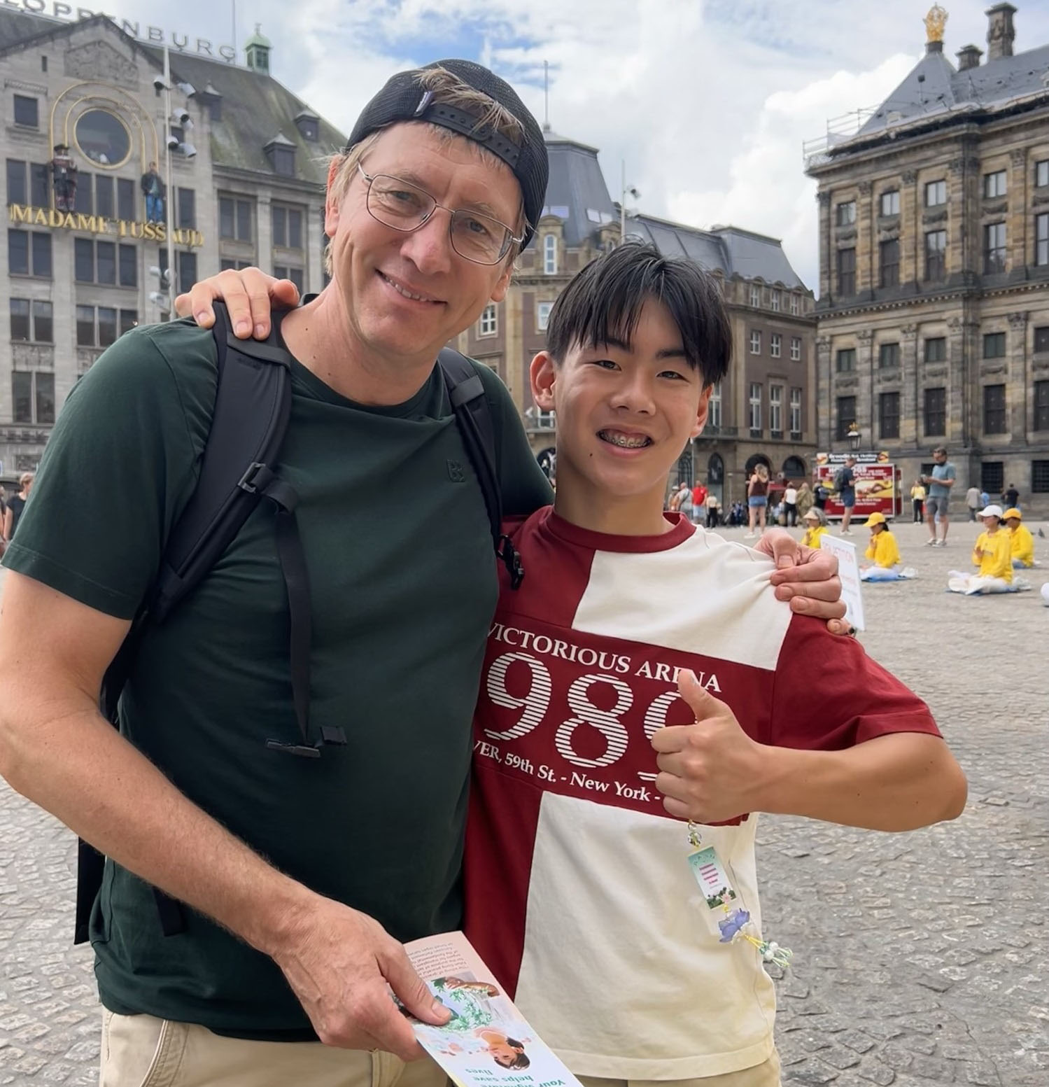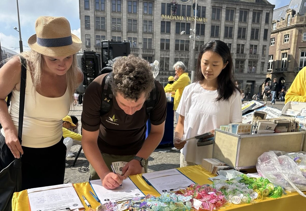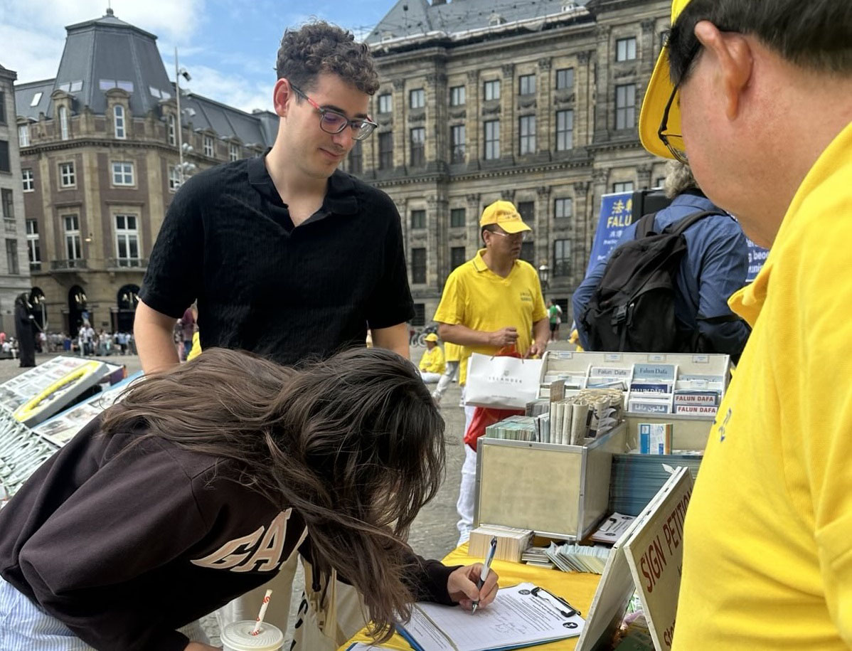 Falun Gong praktikanti iz cijele Holandije su se okupili na Trgu Dam u glavnom gradu Amsterdamu 20. jula 2025. godine. Oni su demonstrirali vježbe, govorili ljudima o progonu, prikupljali potpise za peticiju i odali počast kolegama praktikantima koji su izgubili živote tokom progona od strane Komunističke partije Kine (KPK). Pozvali su KPK da okonča svoju 26-godišnju kampanju progona, diskriminacije, torture i transnacionalne represije nad Falun Gong.