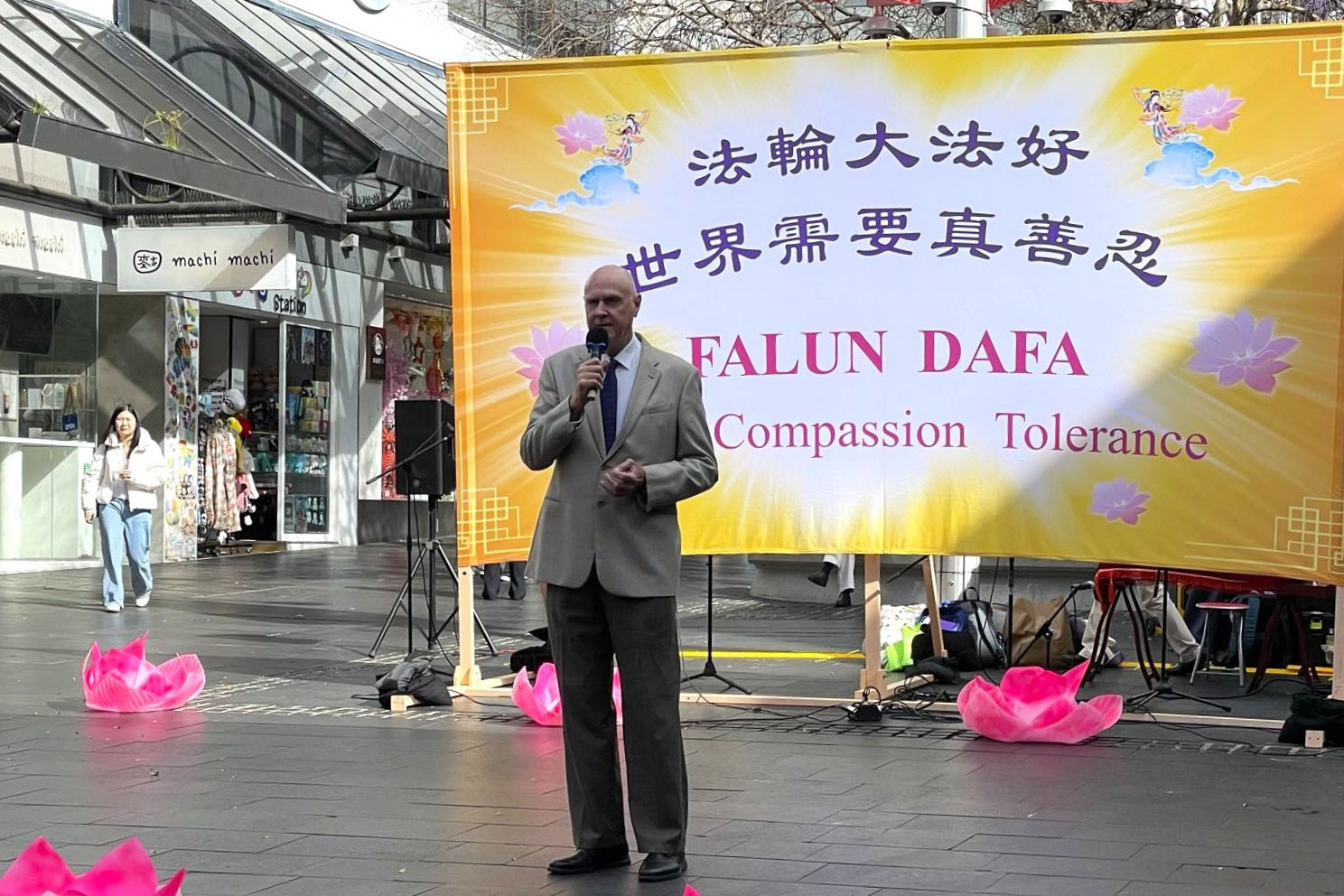 U svom govoru, John Deller, glasnogovornik Australijskog Falun Dafa udruženja, je pozdravio ljude u Chatswoodu prisutne na događaju i objasnio da je to dan slavlja i sjećanja na Falun Dafa, također poznat kao Falun Gong.