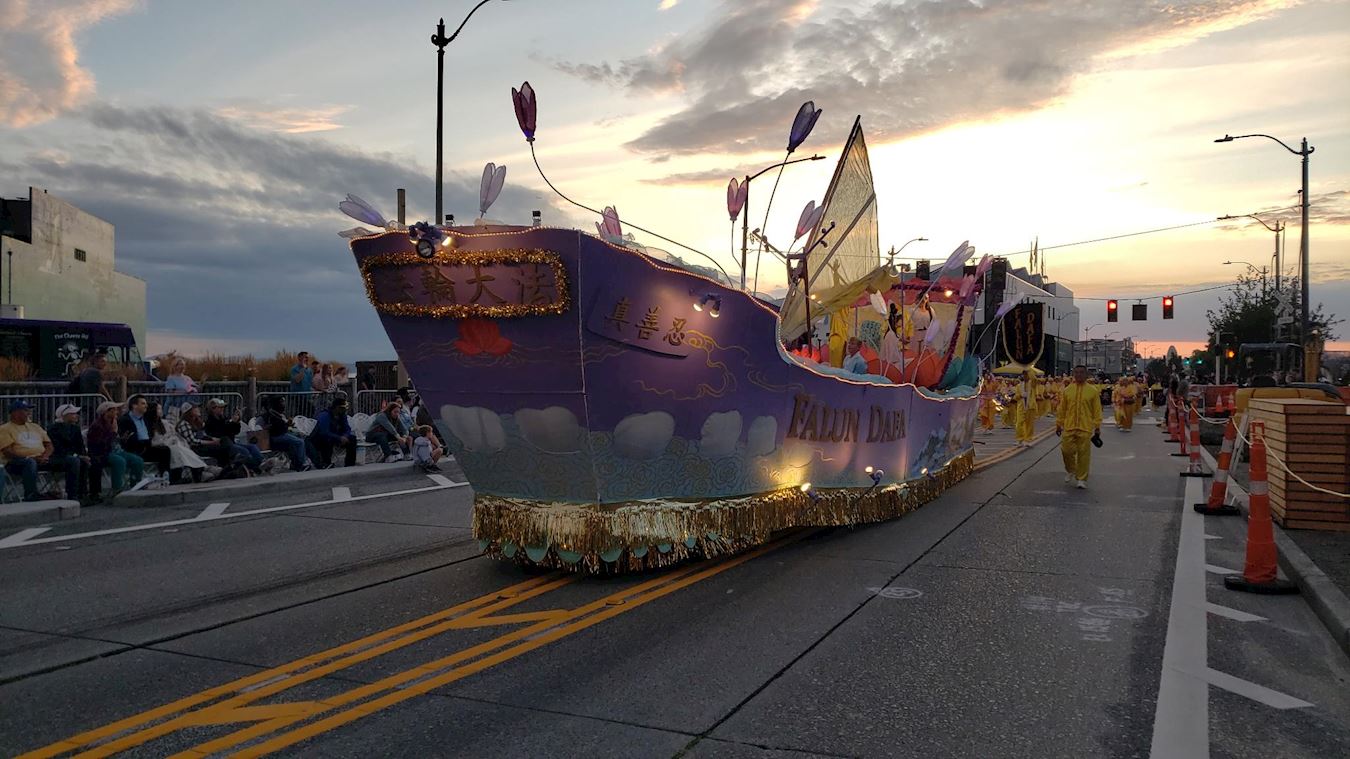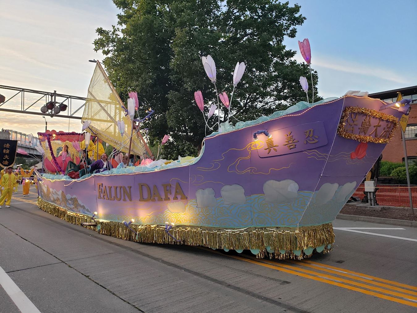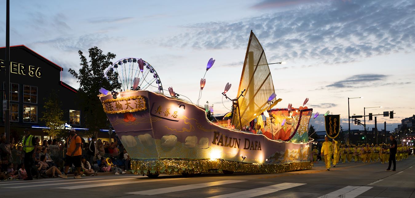 Godišnja Seafair parada sa bakljadom je održana u Seattleu uvečer 26. jula 2025. Hiljade ljudi se poredalo duž ulica da je lično gleda, dok su je hiljade drugih gledale uživo na televiziji ili na internetu. Falun Dafa praktikanti iz Seattlea i Vancouvera su se vozili na splavu koji su sami napravili, svirali su doboše i nosili transparente tokom parade..