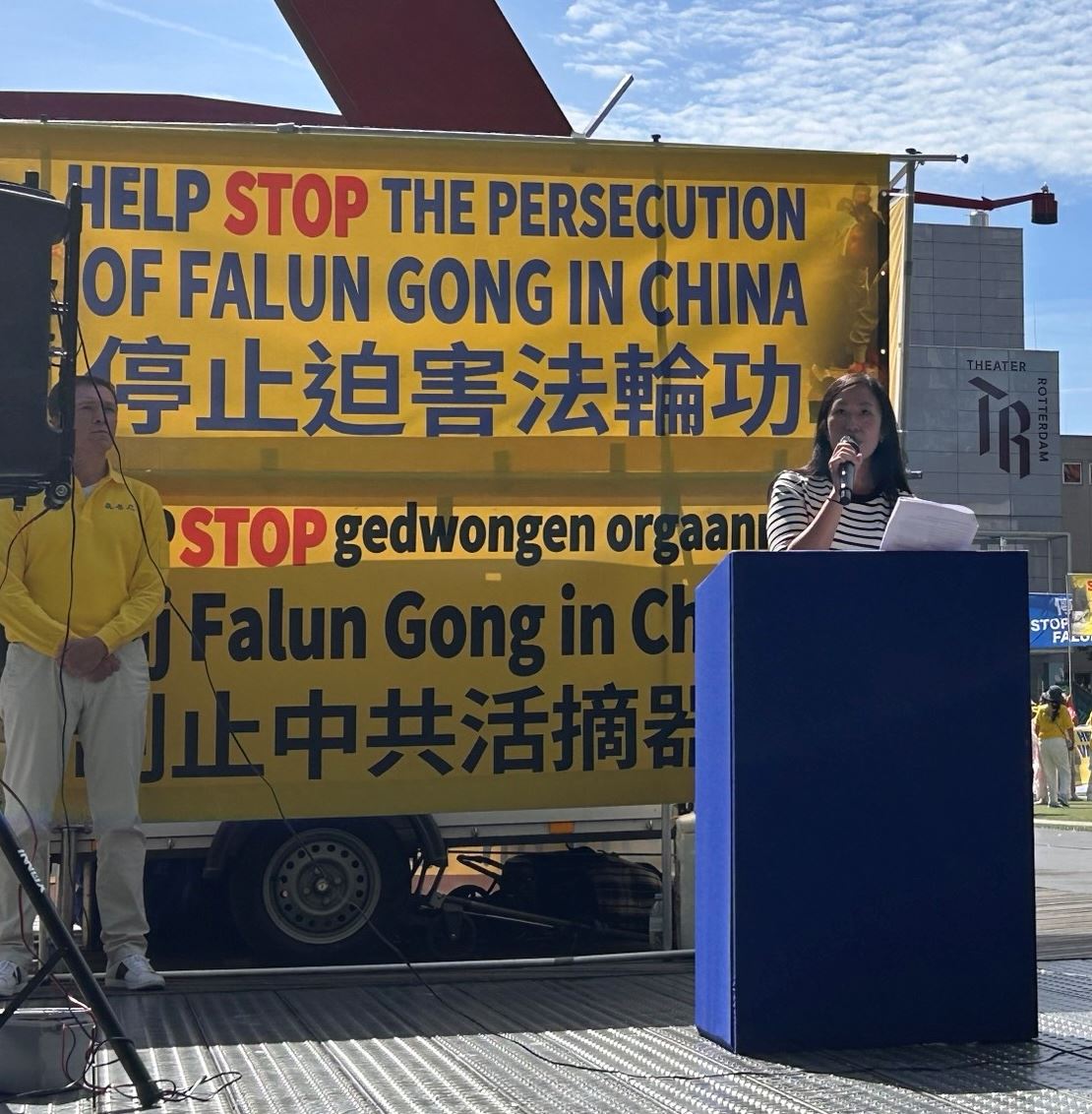 Ka Jan Vong, predsednica Falun Dafa udruženja u Holandiji, govorila je na mitingu i rekla: „Falun Dafa je predstavljena javnosti u Kini 1992. godine. Praksa, zasnovana na principima Istinitosti, Blagosti, Trpeljivosti, poboljšala je zdravlje ljudi i vodila ih da budu dobri. U roku od nekoliko godina, milioni ljudi su prihvatili praksu, što je izazvalo oprez KPK. Od 1999. godine, bezbroj nevinih praktikanata samovoljno privode i podvrgavaju torturi i drugim zlostavljanjima kako bi ih naterali da se odreknu svoje vere. Vade im organe bez pristanka i prodaju ih za ogroman profit. Sve je zabeleženo. Progon KPK se proširio u inostranstvo. KPK čini svakojake zle stvari, uključujući pretnje i prinudu. Godinama su članovi vlada u raznim zemljama govorili protiv progona Falun Gonga od strane KPK. Ovom prilikom, Amnesty International poziva da se brutalni progon praktikanata Falun Gonga okonča. Kineske vlasti moraju odmah zaustaviti ovaj progon i osloboditi sve pritvorene praktikante.“