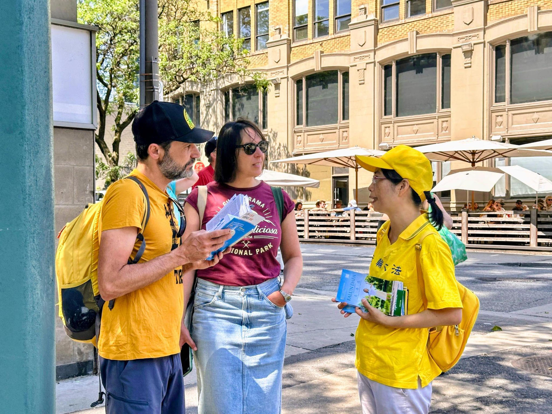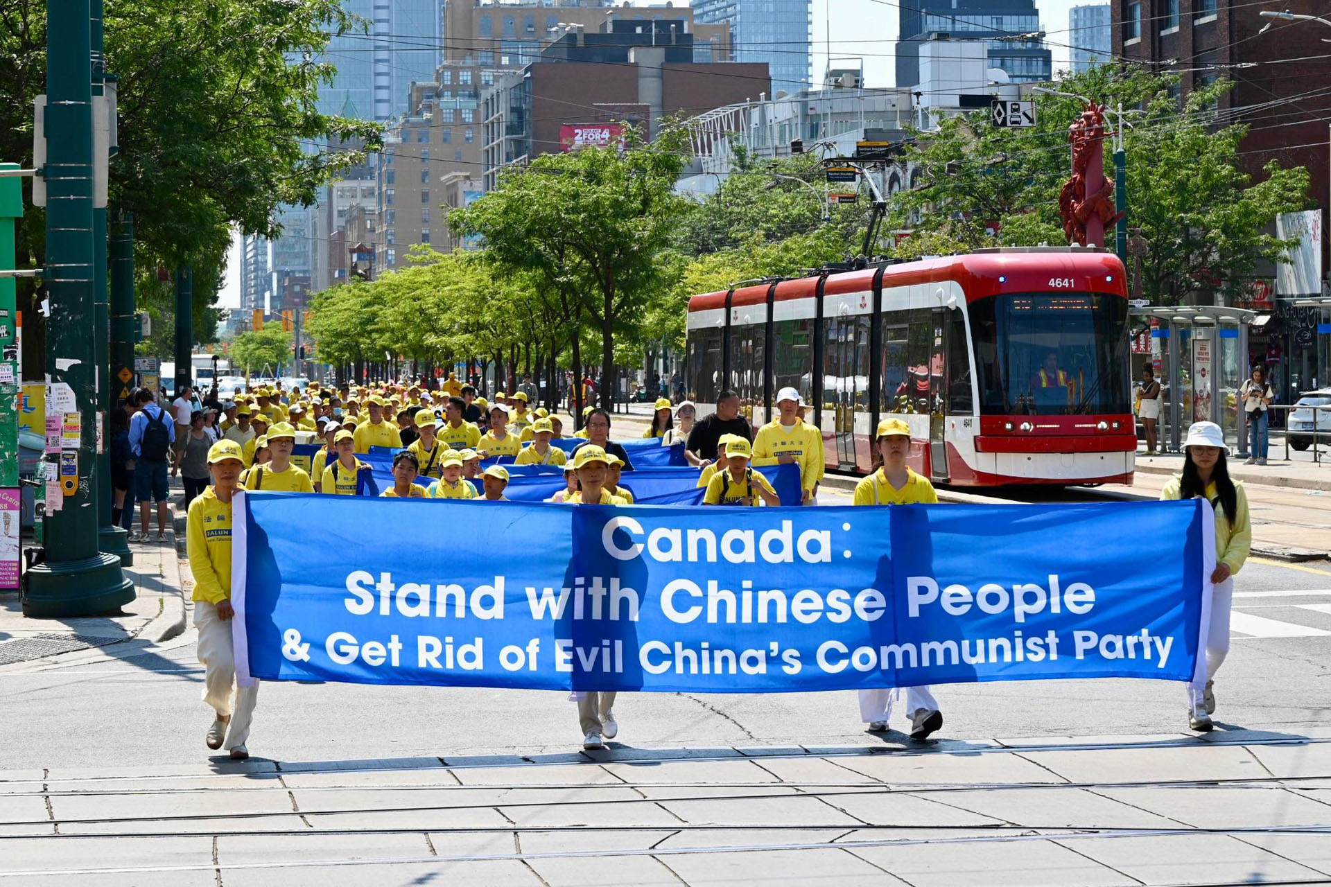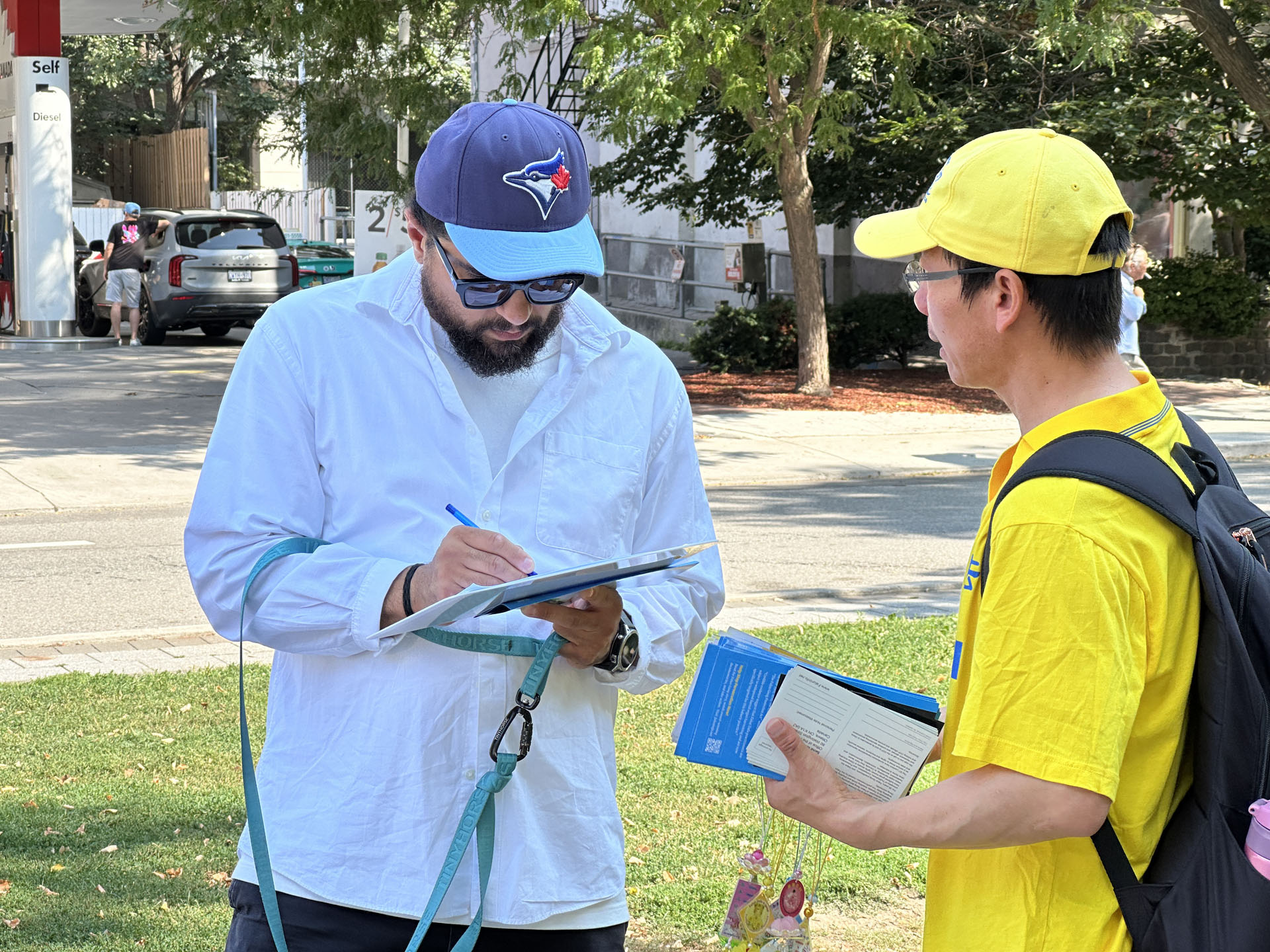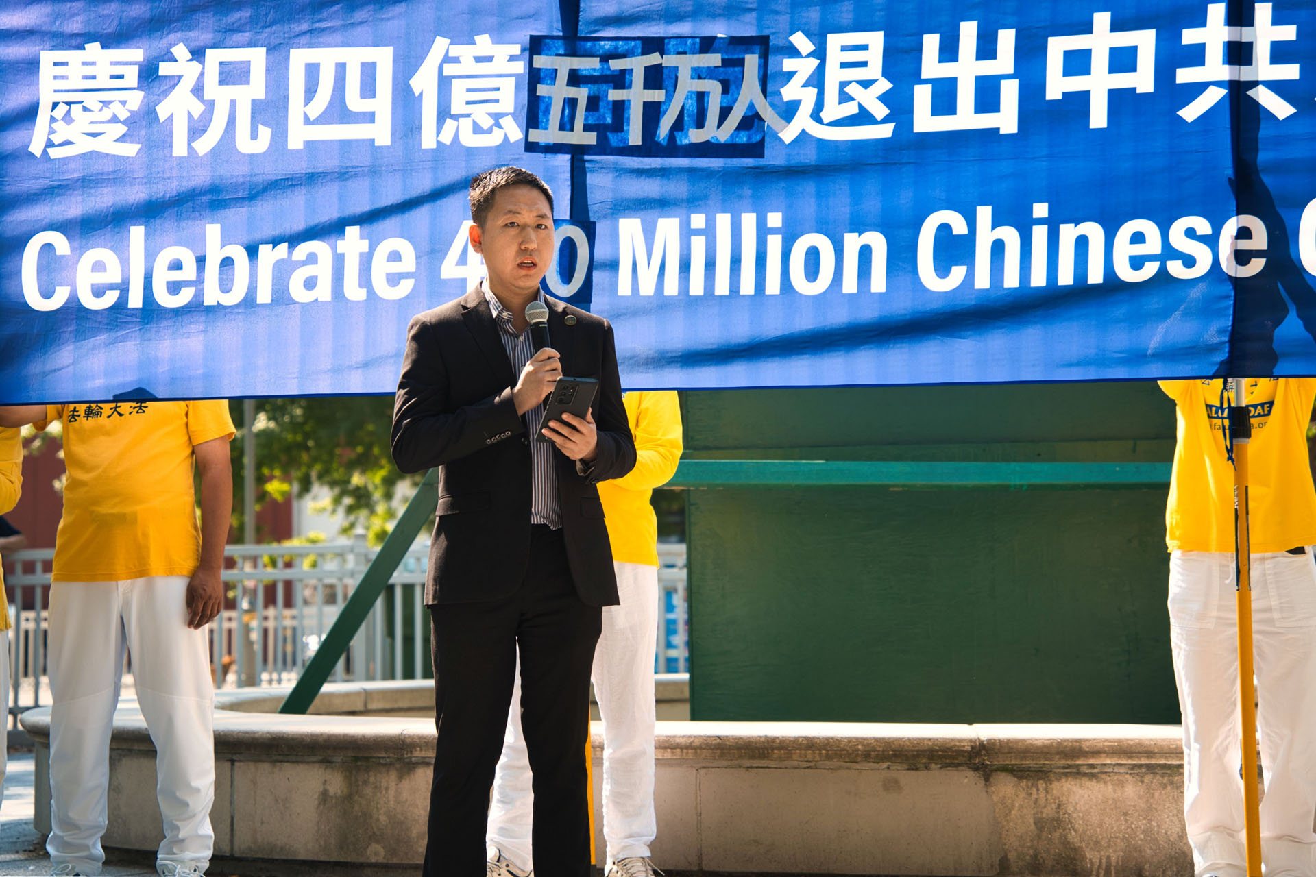 Praktikanti Falun Dafa u Torontu održali su skup u parku Clarence Square u blizini Kineske četvrti 16. kolovoza 2025. kako bi čestitali 450 milijuna Kineza koji su istupili iz Komunističke partije Kine (KPK) i njezinih omladinskih organizacija. Odali su počast svima koji su hrabro donijeli ovaj izbor i pozvali su sve sektore kanadskog društva da pomognu u zaustavljanju transnacionalne represije KPK nad praktikantima Falun Dafa koji žive u Kanadi. Ljudi iz svih sfera života govorili su na skupu, izražavajući svoju podršku i zahvalnost za mirni prosvjed praktikanata Falun Dafa, posebno u pomaganju javnosti da shvati pravu prirodu KPK.