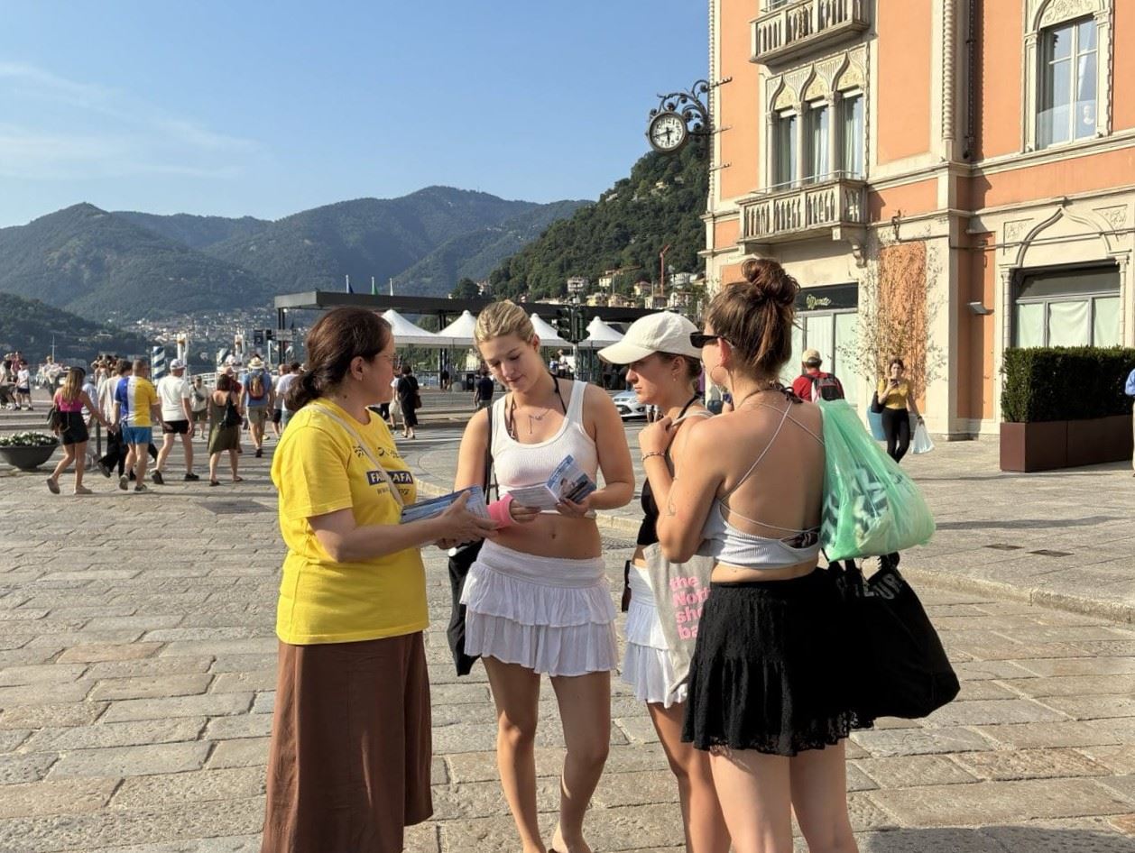 1. avgusta, praktikanti u severnoj Italiji održali su događaj u Komu. U podnožju Alpa, pored Švajcarske i na obali jezera Komo, Komo je još jedna popularna turistička destinacija gde su ljudi sa zadovoljstvom čuli za Falun Dafu..