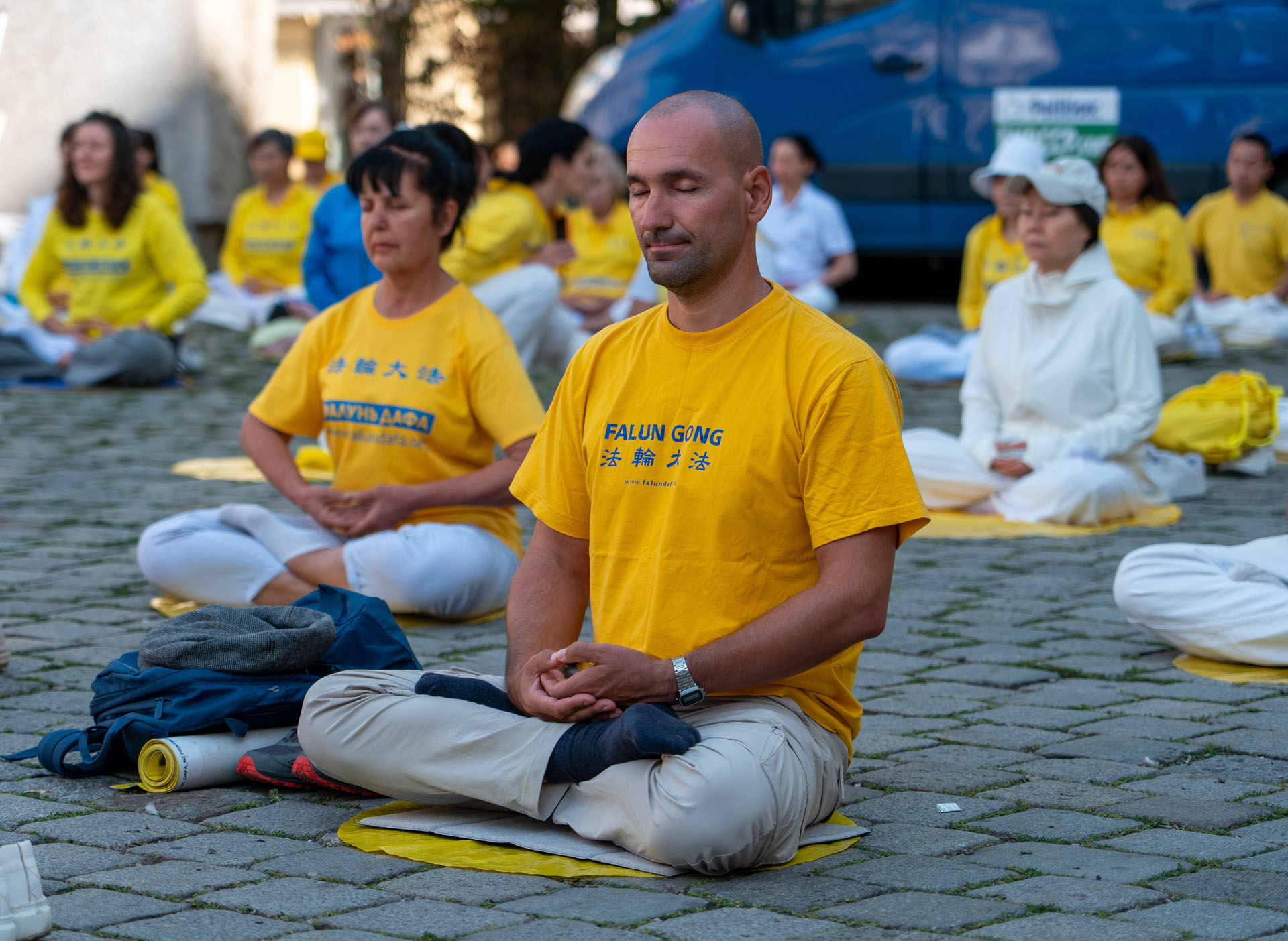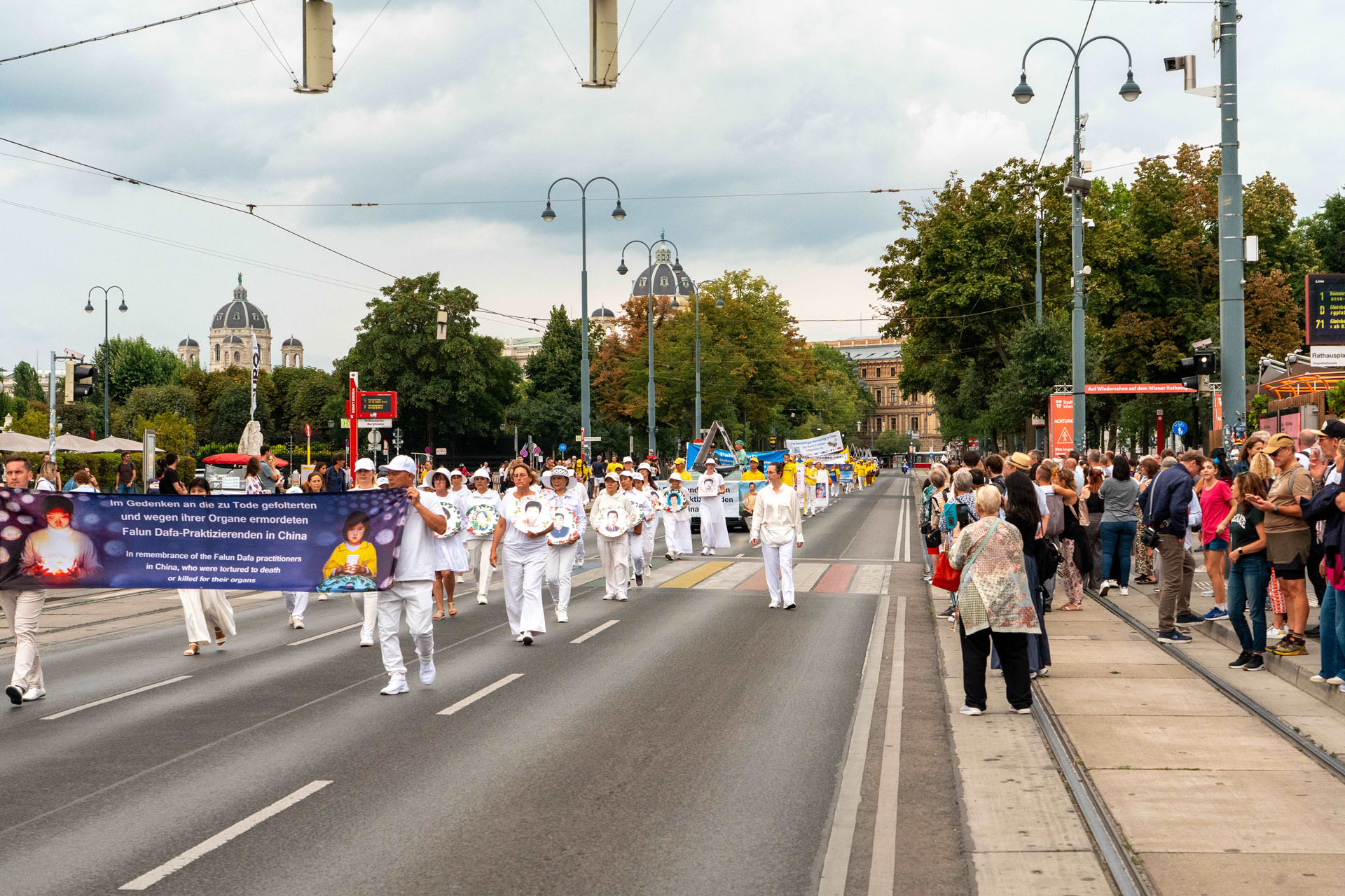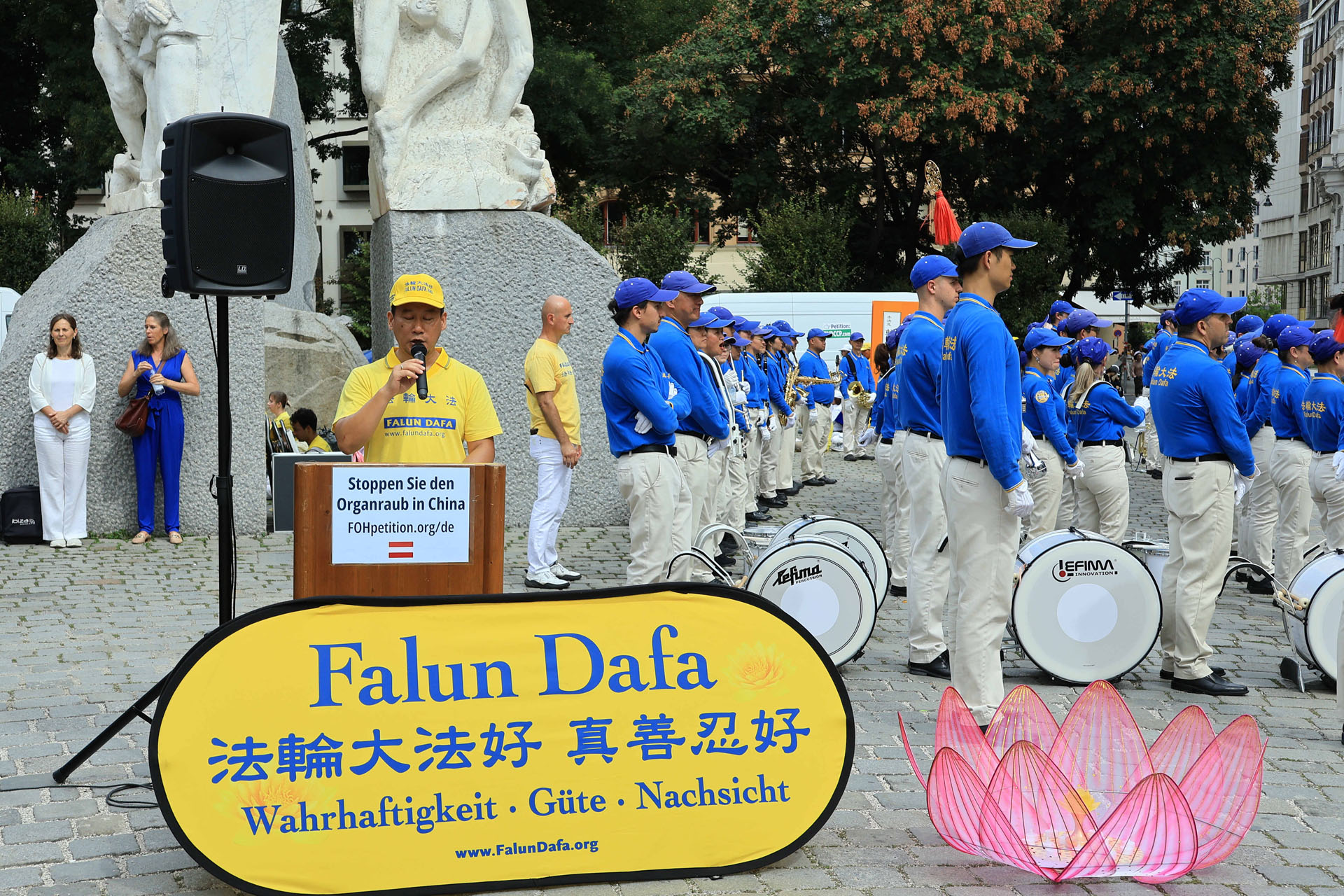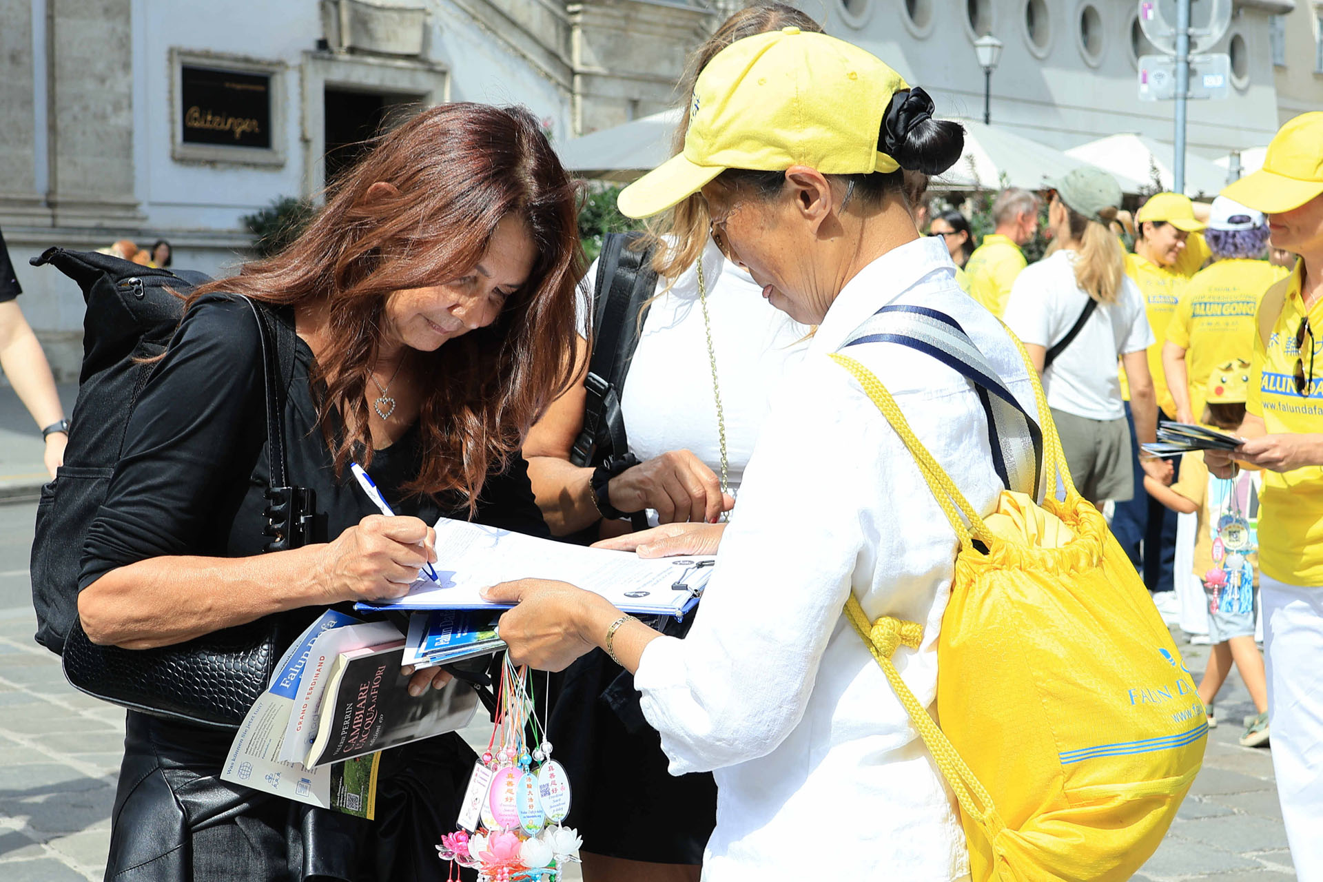 Osim što su ljudima govorili o dobrobitima Falun Dafa, putem plakata i govora na Helmut-Zilk-Platz-u, praktikanti su također objasnili kako KPK proganja praktikante 26 godina.