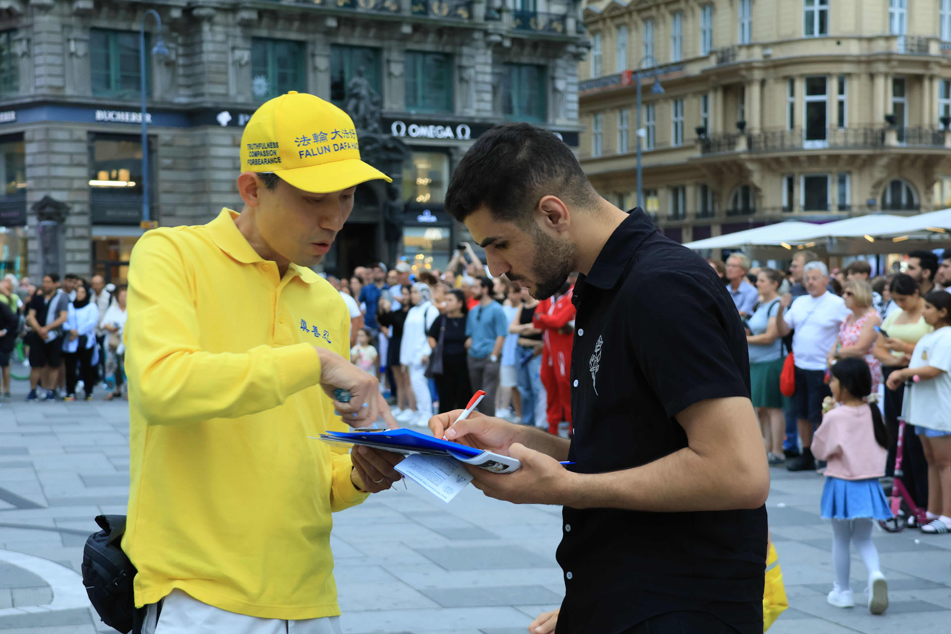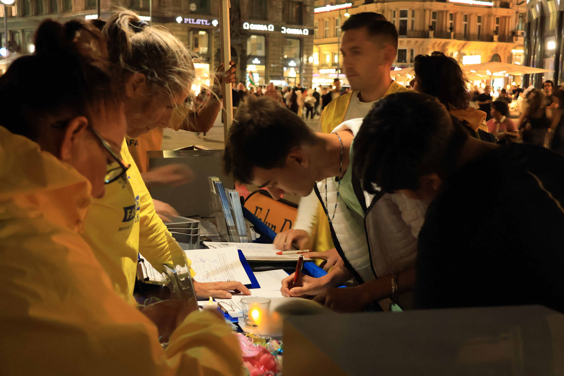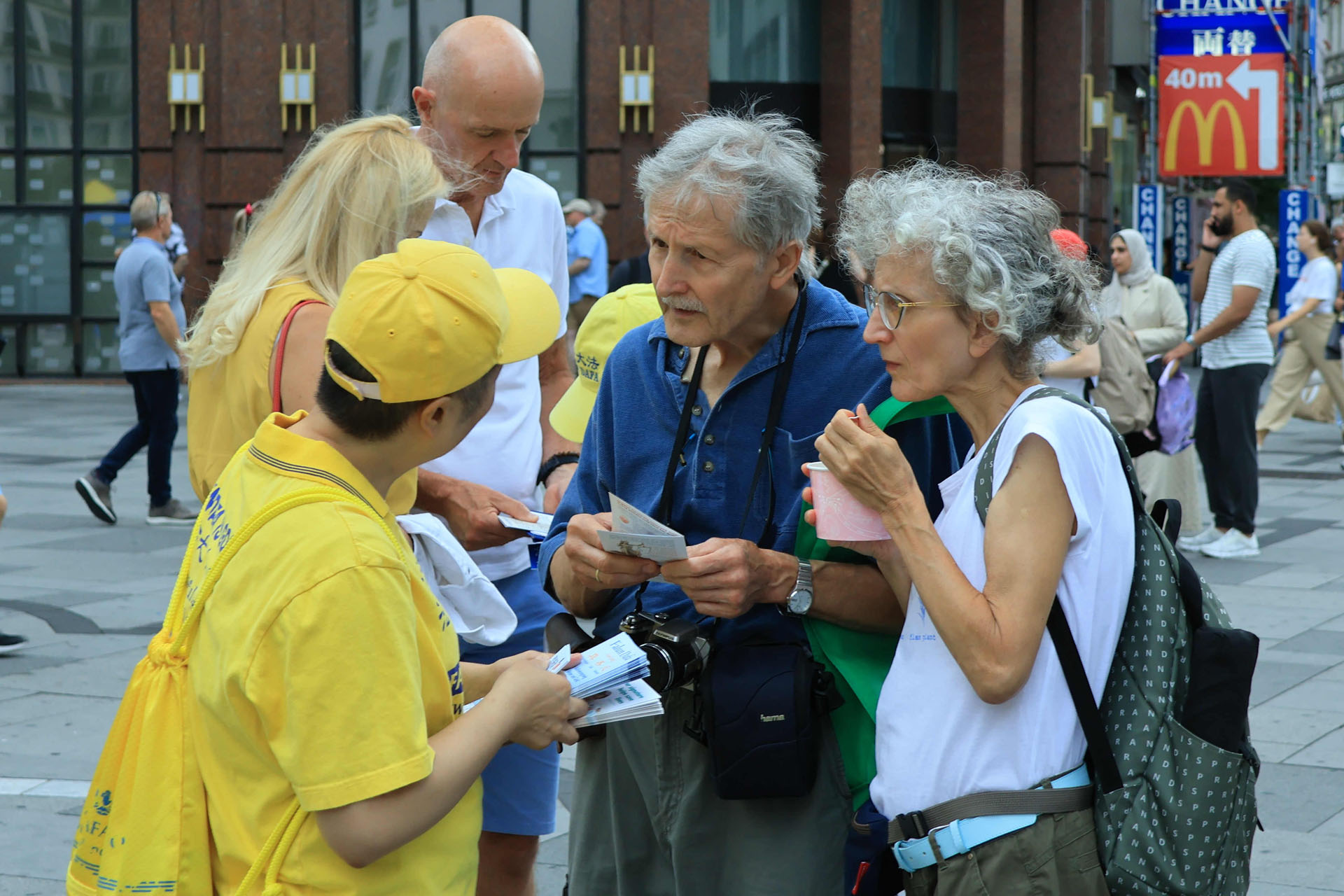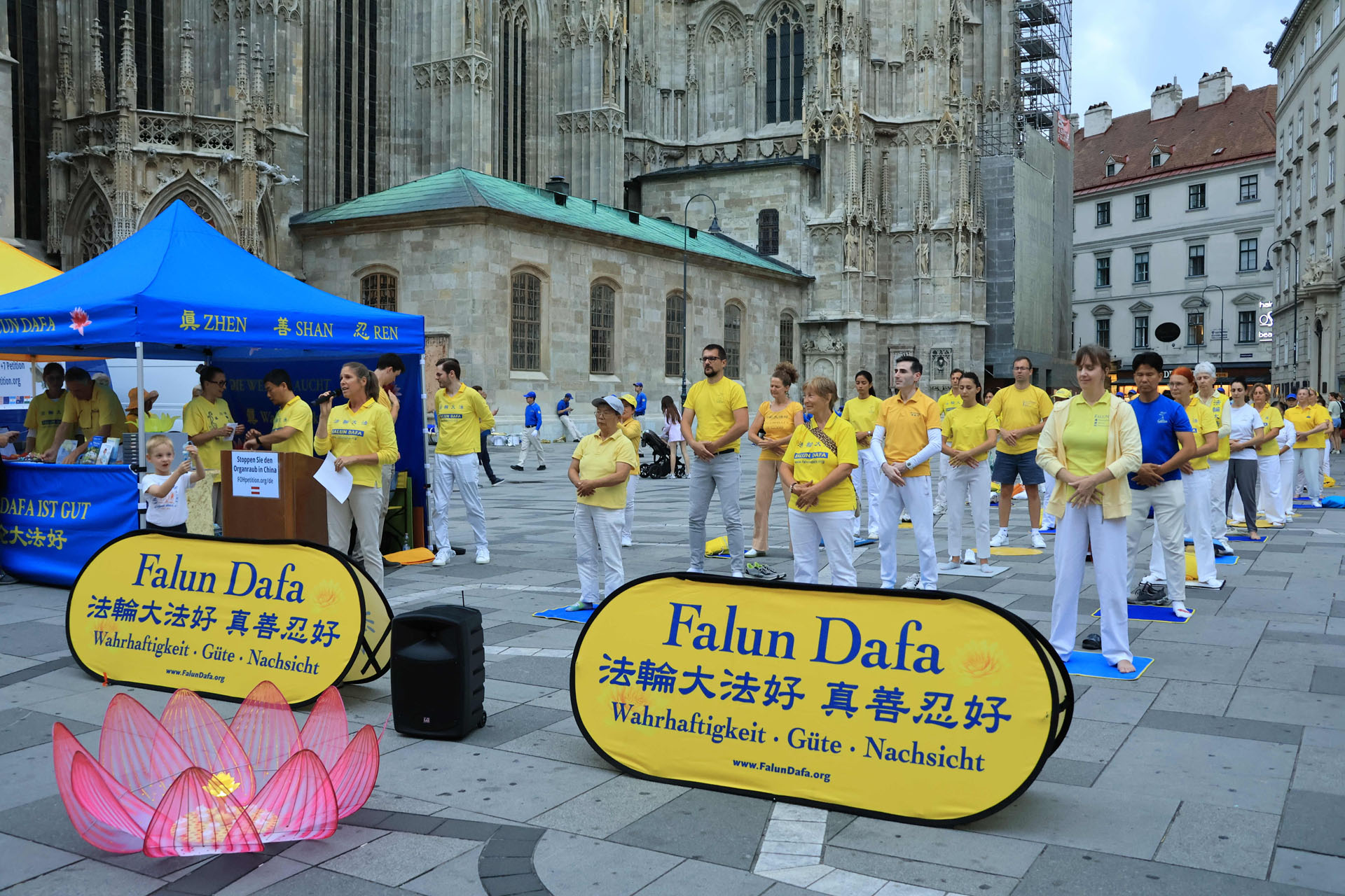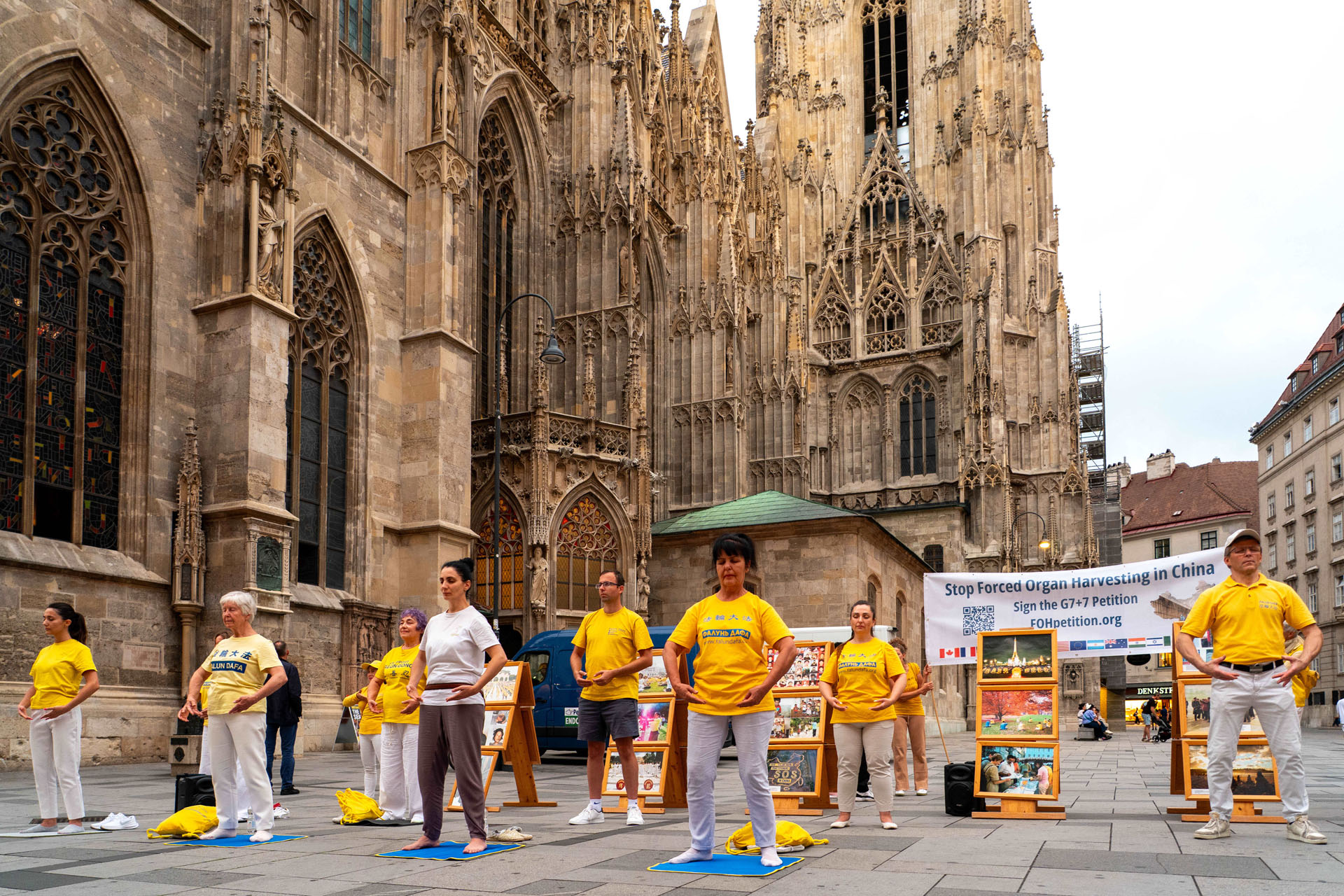 Katedrala Svetog Stefana, koja se uzdiže iznad trga Stephansplatz, je nezaobilazna destinacija za turiste. To je također popularno mjesto gdje se okupljaju mještani i trg je čak prometan i noću. Ljudi koji su prolazili trgom su pažljivo slušali govore praktikanata kako bi saznali o progonu u Kini; neki su uzimali letke i postavljali pitanja; drugi su gledali fotografije koje su prikazivale razne mirne aktivnosti održane tokom proteklih 26 godina kako bi se razotkrile brutalnosti; neki su došli do privlačnog plavog šatora da uzmu više materijala. Ljudi su potpisali peticiju koja poziva Komunističku partiju Kine (KPK) da prestane progoniti Falun Gong i vršiti žetvu organa od njih.