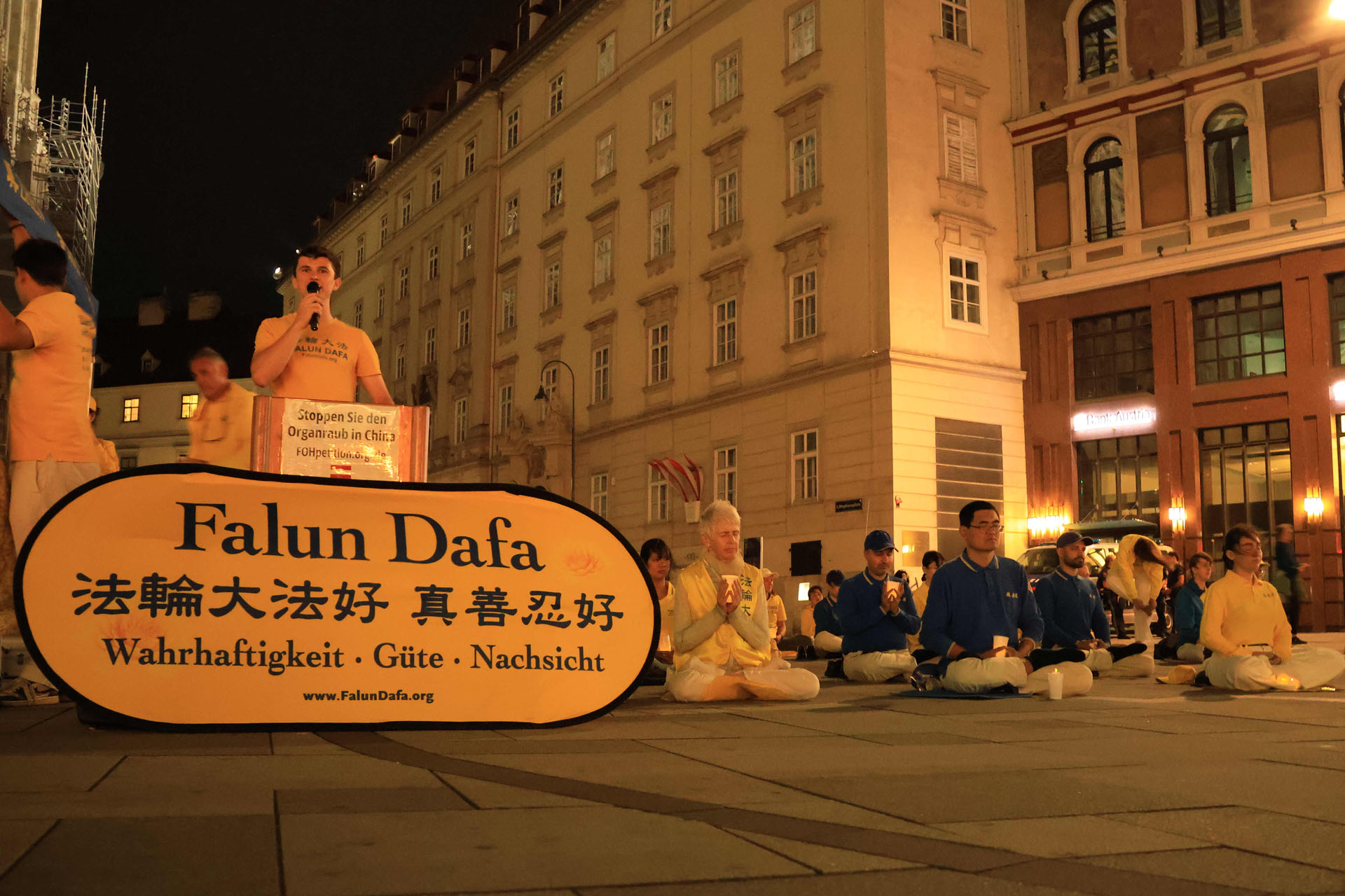 Praktikanti iz više od 10 evropskih zemalja su demonstrirali Dafa vježbe na Stephansplatzu, u Beču, uveče 29. augusta 2025. godine, kako bi predstavili Falun Gong (Falun Dafa). Te večeri, su održali bdijenje uz svijeće u spomen na praktikante koji su izgubili živote tokom 26 godina dugog progona.