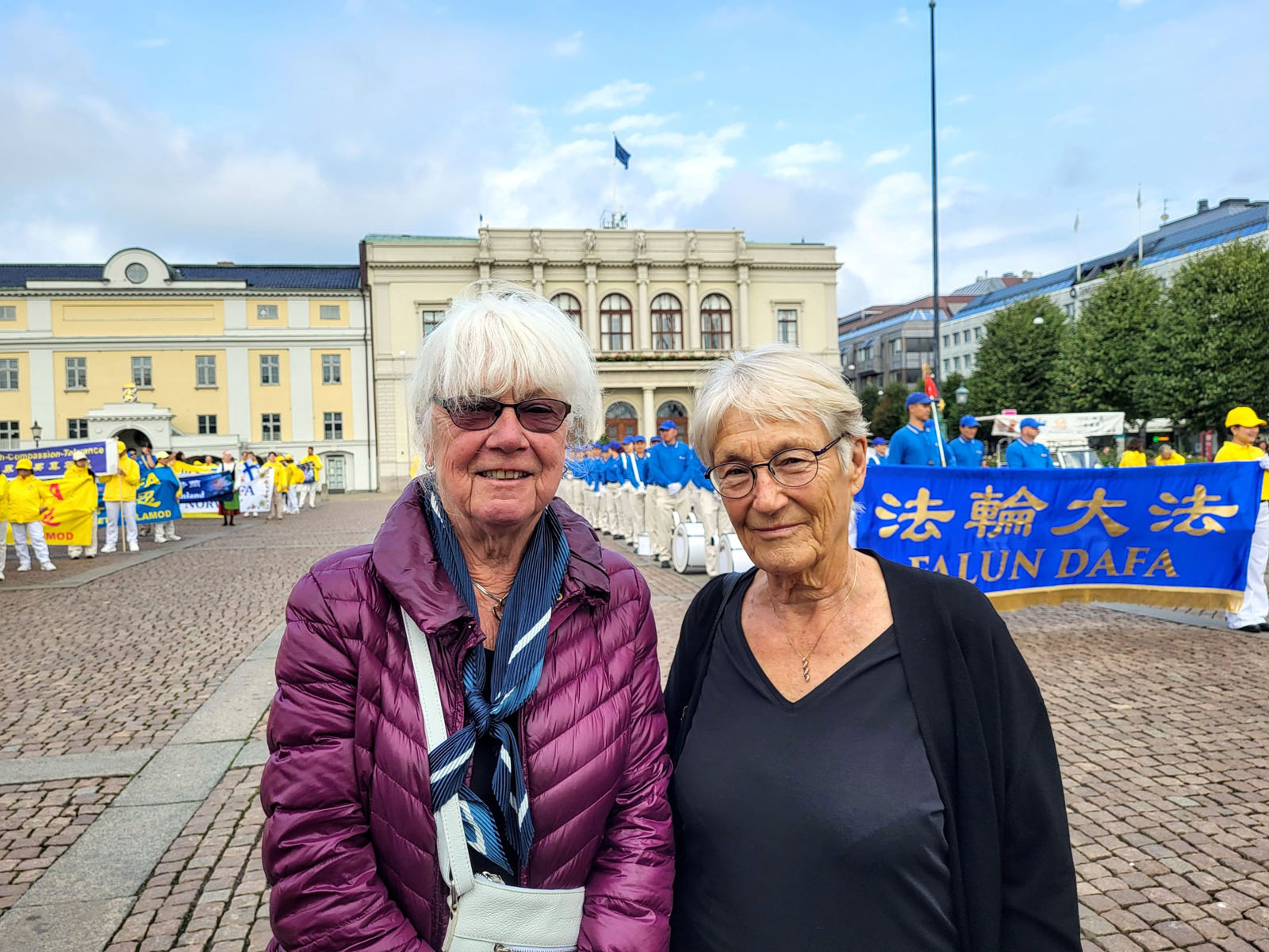 Gospođa Lotta, 80, i gospođa Kristel, 76, su oboje stanovnice Geteborga. Gospođa Kristel je kazala da Falun Dafa prakticira dvije godine. Pročitala je glavnu knjigu Falun Dafa, Zhuan Falun, dva puta i kazala je da je praksa održava zdravom, te da knjigu vrijedi čitati iznova i iznova.