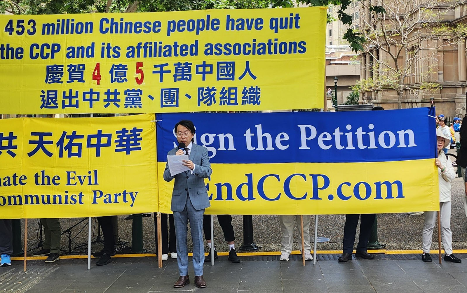 Profesor Feng Chongyi, stručnjak za Kinu i izvanredni profesor Tehnološkog sveučilišta u Sydneyu (UTS), govorio je na skupu, hvaleći pokret povlačenja koji su pokrenuli te promoviraju Falun Dafa praktikanti (također poznatog kao Falun Gong). Pokret je nazvao „najuspješnijim i najvećim društvenim pokretom protiv tiranije KPK. Upravo zahvaljujući vašim naporima i uspjehu, sve više zemalja i ljudi diljem svijeta se budi i potpuno je svjesno zle prirode režima KPK. Impresionirani su vašom hrabrošću, upornošću i mudrošću te su odlučni, poput mene, podržati vaš veliki cilj.“