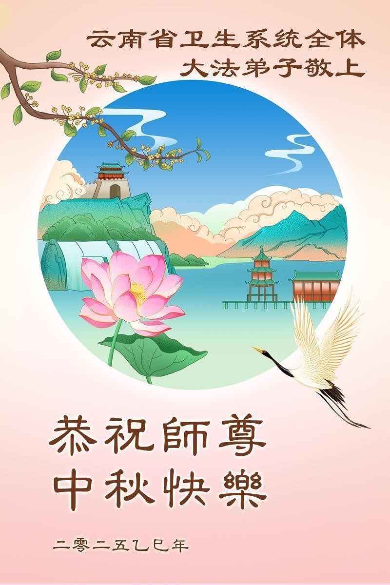 Praktikanti Falun Dafe u različitim profesijama, uključujući pravo, vodozaštitu, računovodstvo, građevinarstvo, elektroenergetske sisteme, naftna polja i upravljanje šumarstvom u provincijama Šandong, Hebej, Đilin, Đijangsu, Šansi, Sičuan i Junan, žele Učitelju srećan Praznik sredine jeseni!