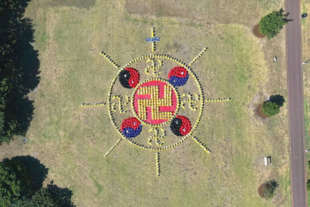 Praktikanti su formirali sliku Faluna prečnika 24 metra. Dodajući spoljne zrake, prečnik cele slike bio je 37 metara. Simbol Faluna sastoji se od para Taiči simbola koji su crveni na vrhu i crni na dnu, još jednog para koji su crveni na vrhu i plavi na dnu, kao i zlatnih 卍 simbola. Simbol Falun Dafe, Falun amblem je minijatura univerzuma.