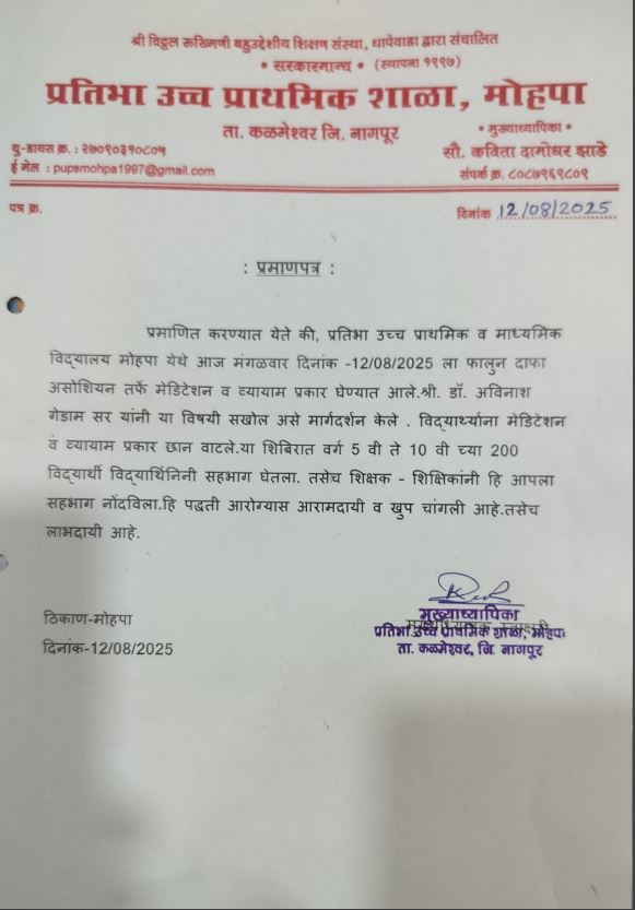 „Ovim se potvrđuje da su u utorak, 12. augusta 2025. godine, u Pratibha višoj osnovnoj i srednjoj školi, Mohpa, Falun Dafa praktikanti vodili Falun Dafa meditaciju i vježbe pod vodstvom dr. Avinasha Gedama.