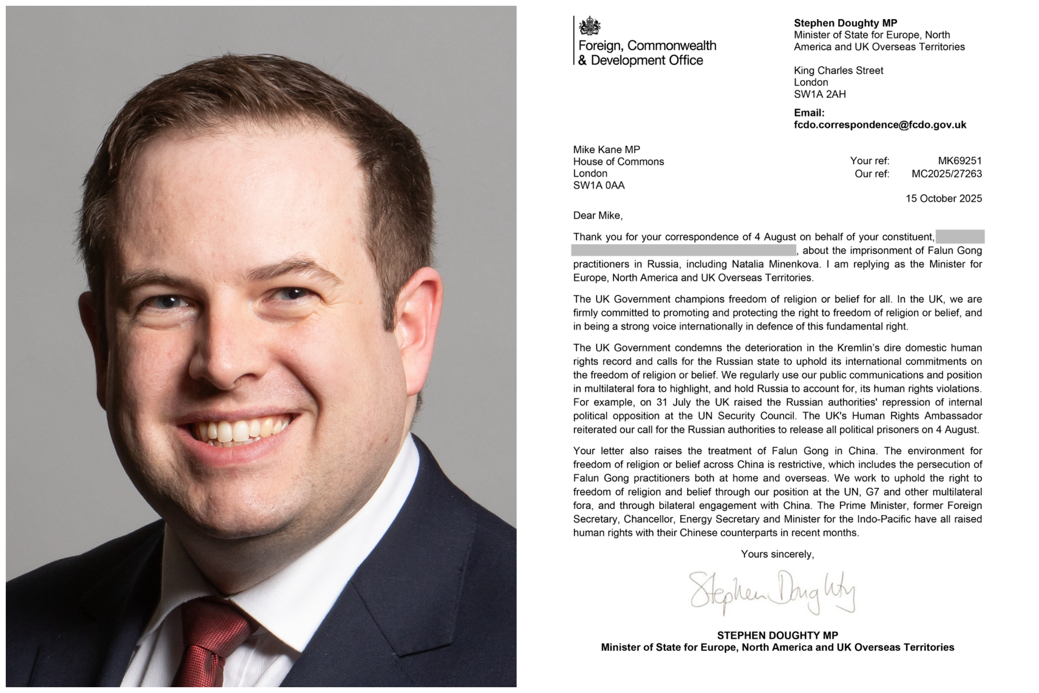 Stephen Doughty, zastupnik, državni ministar za Evropu, Sjevernu Ameriku i prekomorske teritorije Ujedinjenog Kraljevstva, je u svom odgovoru na pismo gospodina Mikea Kanea, zastupnika, izjavio: „Vlada Ujedinjenog Kraljevstva zagovara slobodu vjeroispovijesti ili vjerovanja za sve. U Ujedinjenom Kraljevstvu, čvrsto smo posvećeni promovisanju i zaštiti prava na slobodu vjeroispovijesti ili vjerovanja, te smo u tom smislu snažan glas na međunarodnom planu u odbrani ovog temeljnog prava.“
