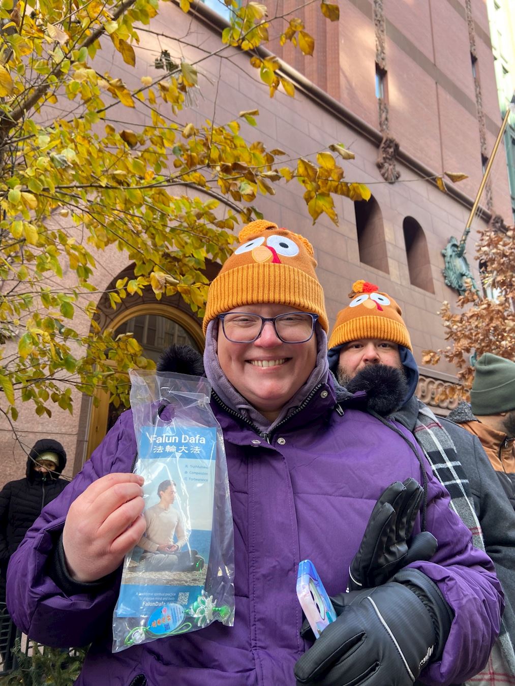 Rekla je da je Dan zahvalnosti praznik koji je navodi da razmišlja i još više ceni Falun Dafu. Njeni roditelji i deca imali su koristi od praktikovanja Dafe. „Zaista sam zahvalna što praktikujem kultivaciju“, rekla je. „Nadam se da ljudi mogu osetiti pozitivnu energiju i toplinu Falun Dafe na ovaj hladni praznik putem ove parade.“