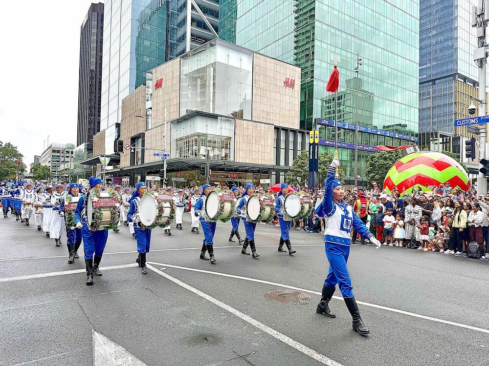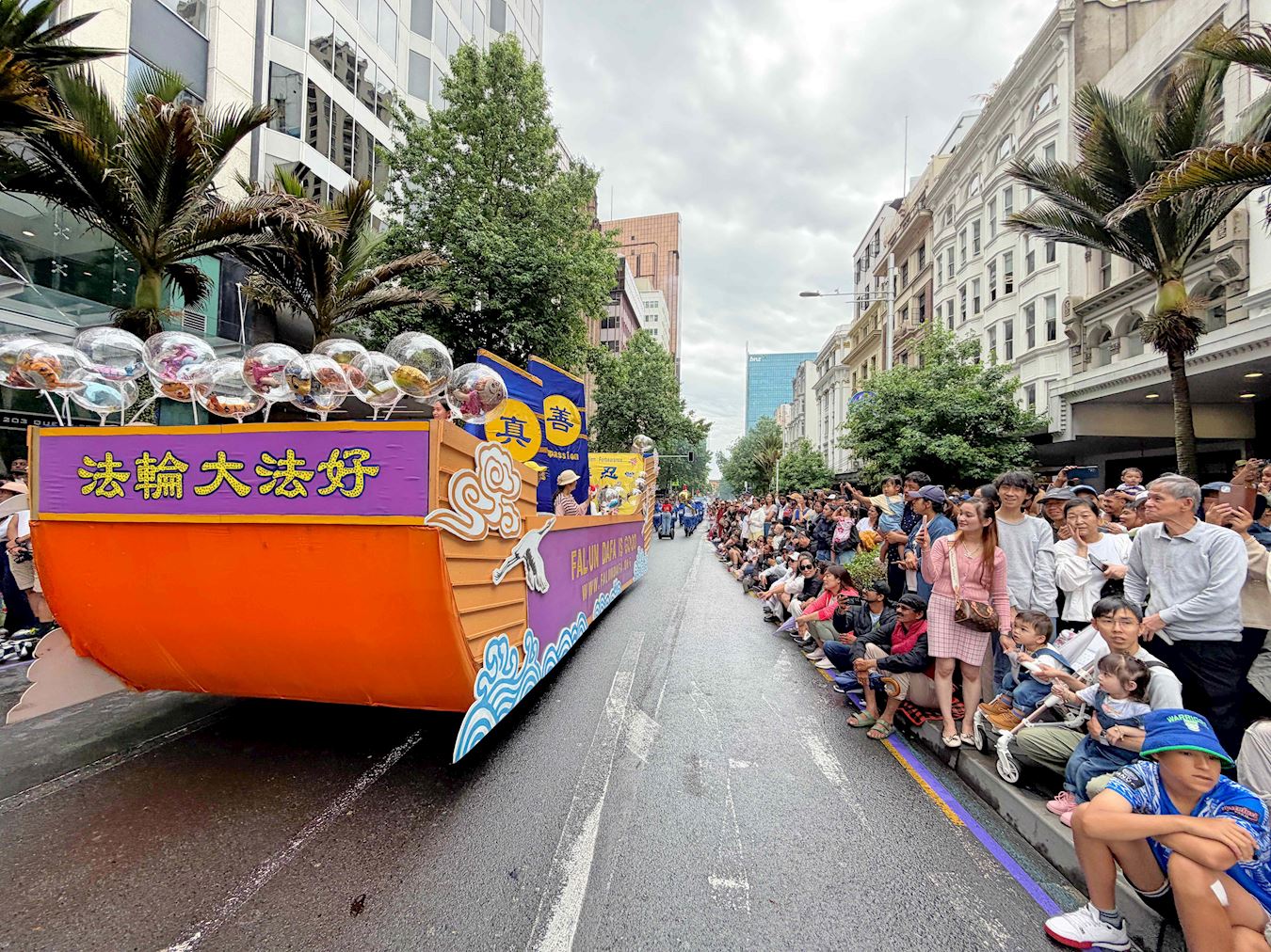 Gledaoci su toplim aplauzom pozdravili Tian Guo marširajući orkestar, sastavljen od Falun Dafa praktikanata sa Novog Zelanda i iz Australije. Ljudi su se fotografisali, hvalili orkestar zbog plavo-belih uniformi i rekli da se muzika orkestra savršeno uklopila u prazničnu atmosferu događaja. Upečatljivi transparenti „Istinitost-Blagost-Trpeljivost“ krasili su pokretnu platformu, koju je pratio tim zmajevog plesa, u čemu su deca zaista uživala.