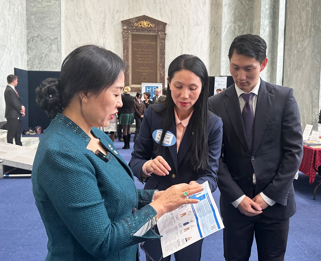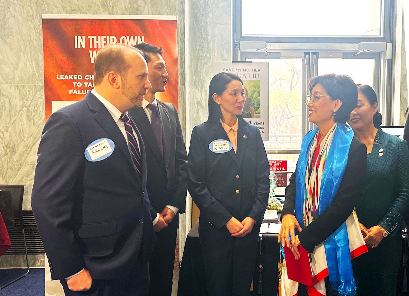 Vang Sjuen, bivši glavni plesač izvođačke trupe Shen Yun, i njegova sestra Lidija Vang, sastali su se sa poslanicom Jang Kim i drugim posetiocima, i opisali patnju svojih roditelja usled progona od strane KPK. Njihov otac je bio zatvaran četiri puta zbog svoje vere u Istinitost, Blagost i Trpeljivost, i preminuo je u septembru 2009. Njihova majka, Liu Aihua, zatvorena je u Kini zbog svoje vere.