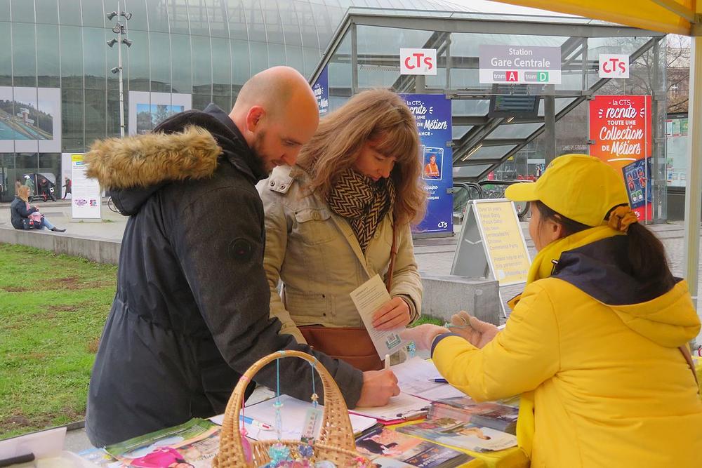 Iako je tog dana padala lagana kiša, te subote prije zimskog odmora, na Trgu Republike i dalje je bilo puno ljudi. Praktikanti su demonstrirali vježbe Falun Gonga i dijelili informacije prolaznicima. Demonstracija vježbi privukla je mnoge da se zaustave i fotografiraju. Neki su ljudi fotografirali i informativne ploče. Brojni su rekli da su bili dirnuti saznanjem o progonu i potpisali su peticiju protiv prisilnog vađenja organa. Mnogi su zahvalili praktikantima što su tamo.