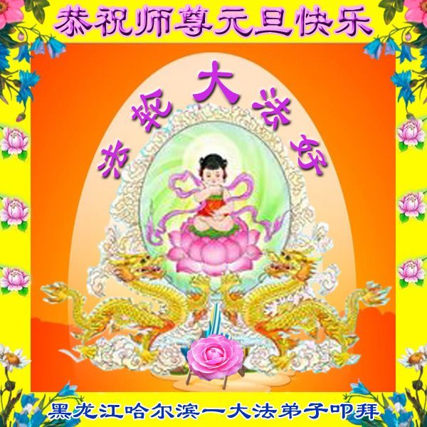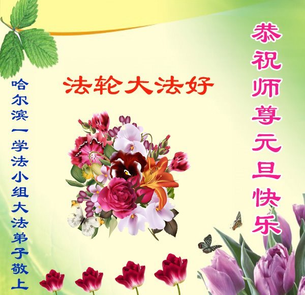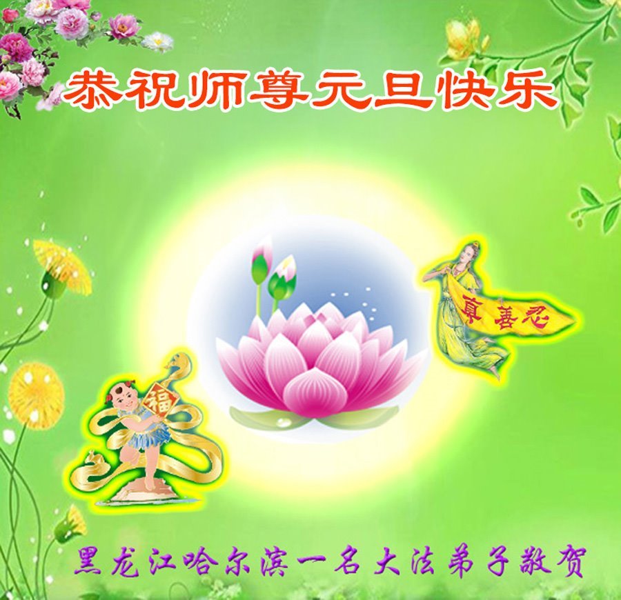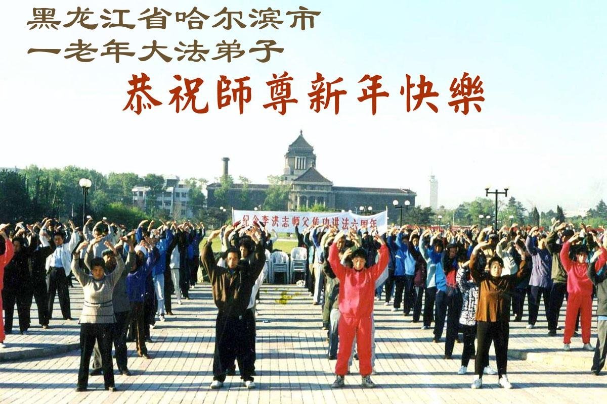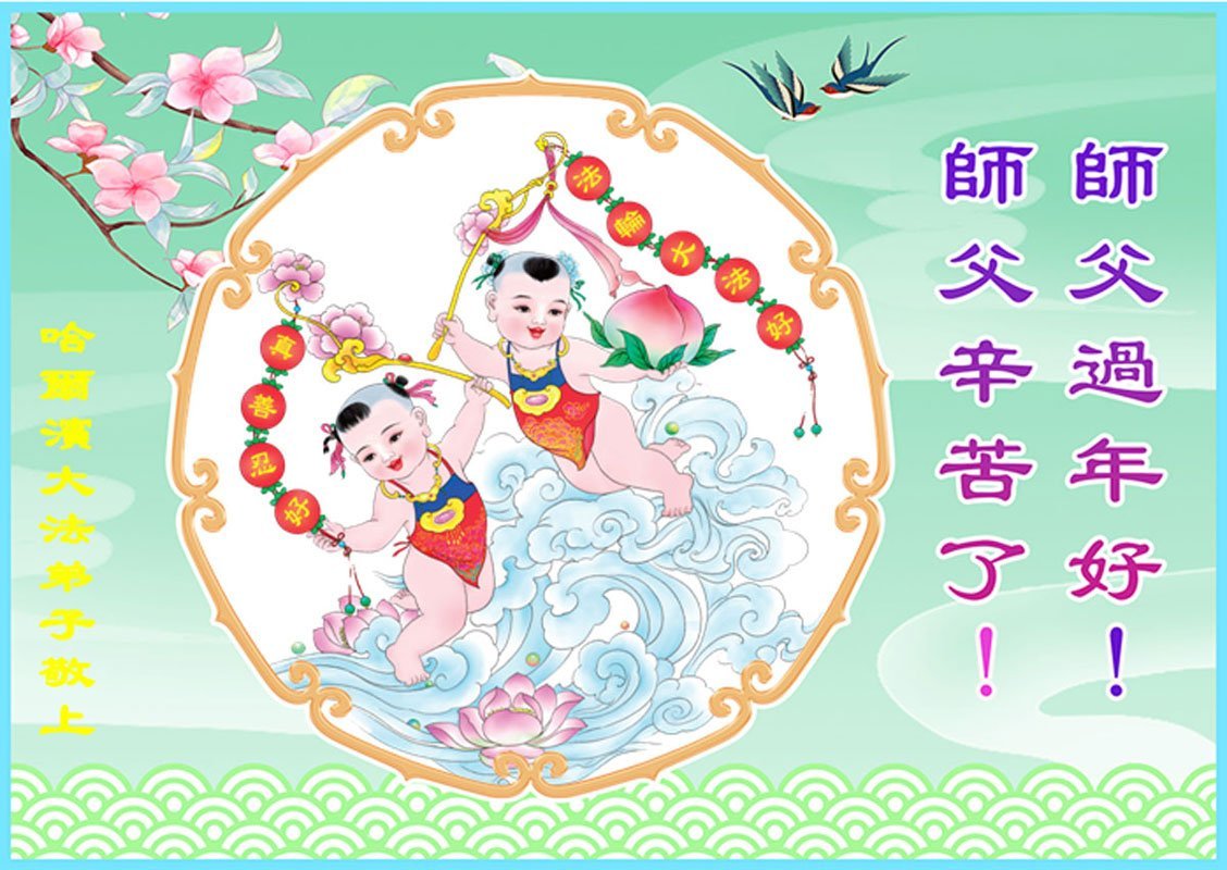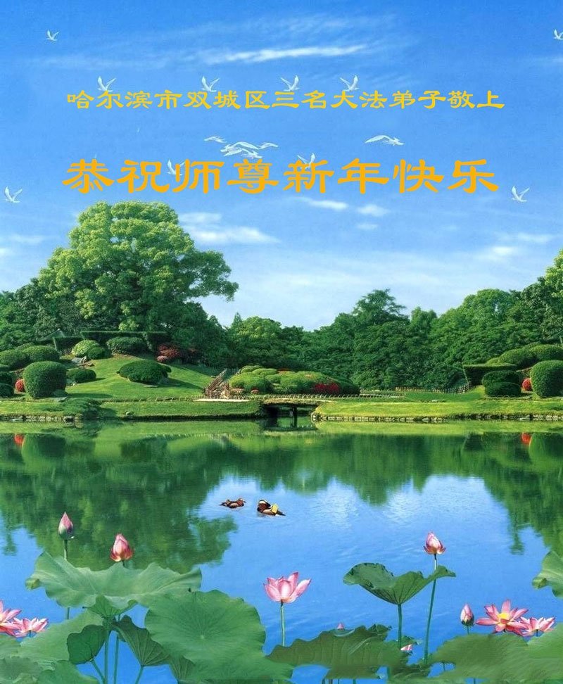 Falun Dafa praktikanti iz grada Harbina s poštovanjem žele Učitelju Li Hongdžiju srećnu Novu godinu (108 čestitki)