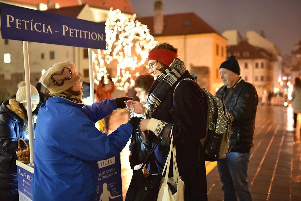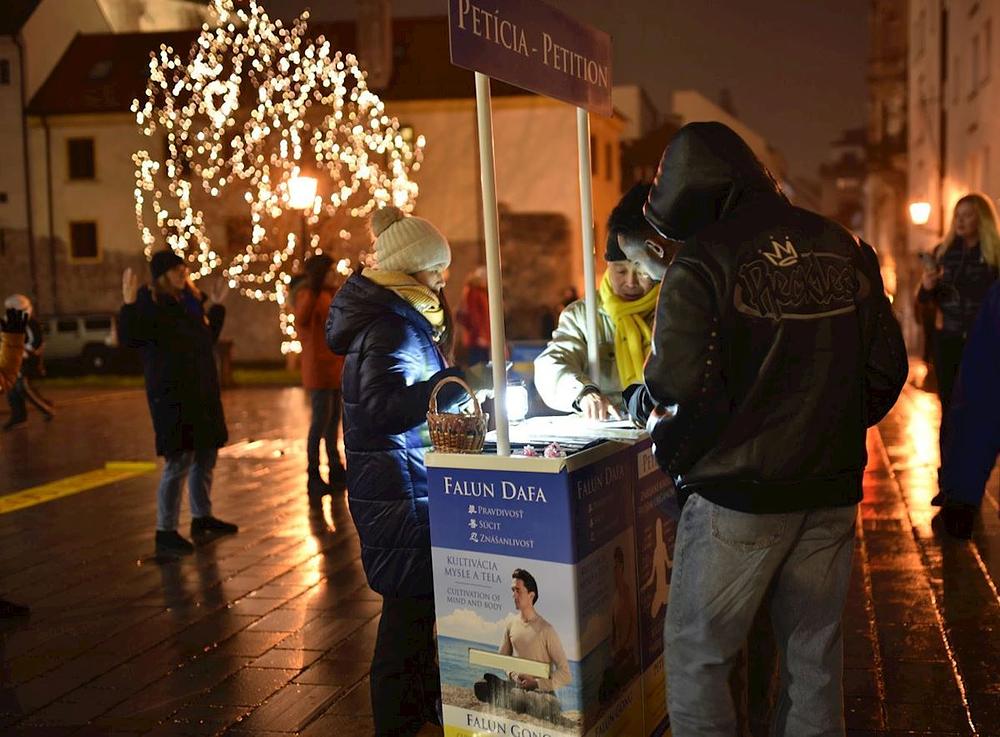 Praktikanti Falun Dafe su tokom događaja u Bratislavi 21. decembra 2025. godine obavestili ljude o brutalnom progonu u Kini i prikupili potpise za peticiju.