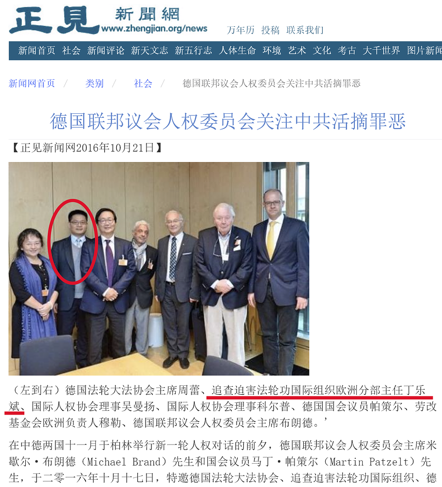 Na primer, po dolasku u Nemačku, Ding je rekao da su članovi njegove porodice uhapšeni u Kini zbog praktikovanja Falun Dafe. Rekao je da mu treba pomoć i tražio da živi sa praktikantom sa Zapada. Iz ljubaznosti i saosećanja, praktikant ga je smestio i vodio u posete desetinama poslanika.