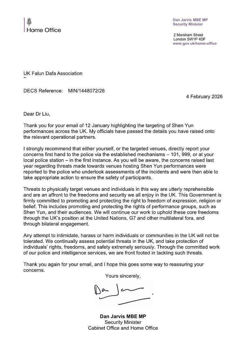 U pismu upućenom Falun Dafa Udruženju Ujedinjenog Kraljevstva  4. februara 2026. godine, ministar sigurnosti Ujedinjenog Kraljevstva Dan Jarvis piše: „Prijetnje fizičkim napadima na mjesta i pojedince na ovaj način su krajnje neprihvatljive i predstavljaju uvredu za slobode i sigurnost koju svi uživamo u Ujedinjenom Kraljevstvu.“