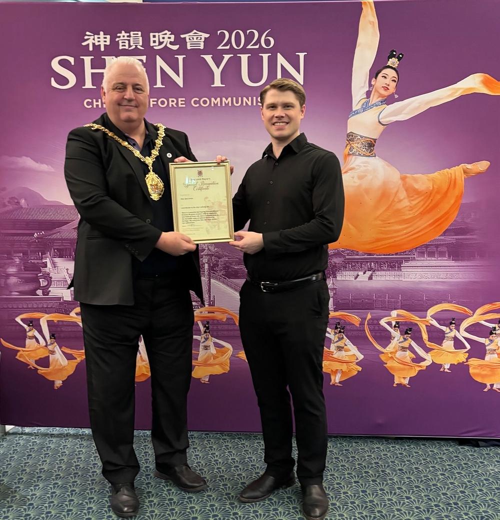 Steve Watkins, gradonačelnik Stoke-on-Trenta, je prisustvovao drugoj predstavi Shen Yun Performing Arts u Regent Theatreu poslijepodne 18. februara 2026. Nakon predstave, gradonačelnik Watkins je Shen Yun-u uručio posebnu zahvalnicu gradonačelnika u čast izuzetnog doprinosa ova izvođačke trupe kulturnom životu grada.
