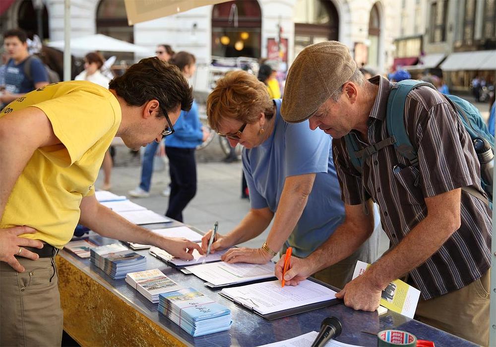 Od maja ove godine, više od 170.000 ljudi unutar i izvan Kine su podnijeli krivične prijave protiv bivšeg kineskog diktatora, Jiang Zemina zbog pokretanja i sprovođenja progona Falun Gonga. Praktikanti su dijelili informativni materijal i prikupljali potpise od turista i drugih prolaznika ispred Michaeler kupole, zvanične rezidencije austrijskog predsjednika.