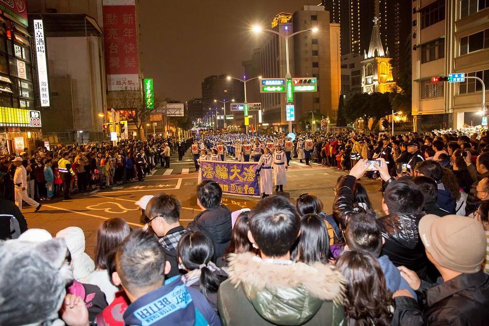 Razdragani su gledaoci tapšali rukama pozdravljajući stupajući orkestar od 100 izvođača, koji je izvodio svoju muziku koja donosi veselo raspoloženje. Na završetku parade domaćin se zahvalio praktikantima Falun Gonga (koji je poznat i pod imenom Falun Dafa) za to što su „donijeli svjetlost“ na Kaoshiung festival lanterni, a onda pozvao hiljade gledalaca da jednoglasno uzviknu: „Falun Dafa je dobar“!