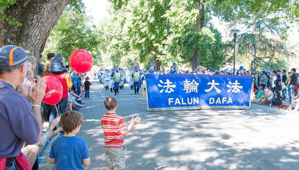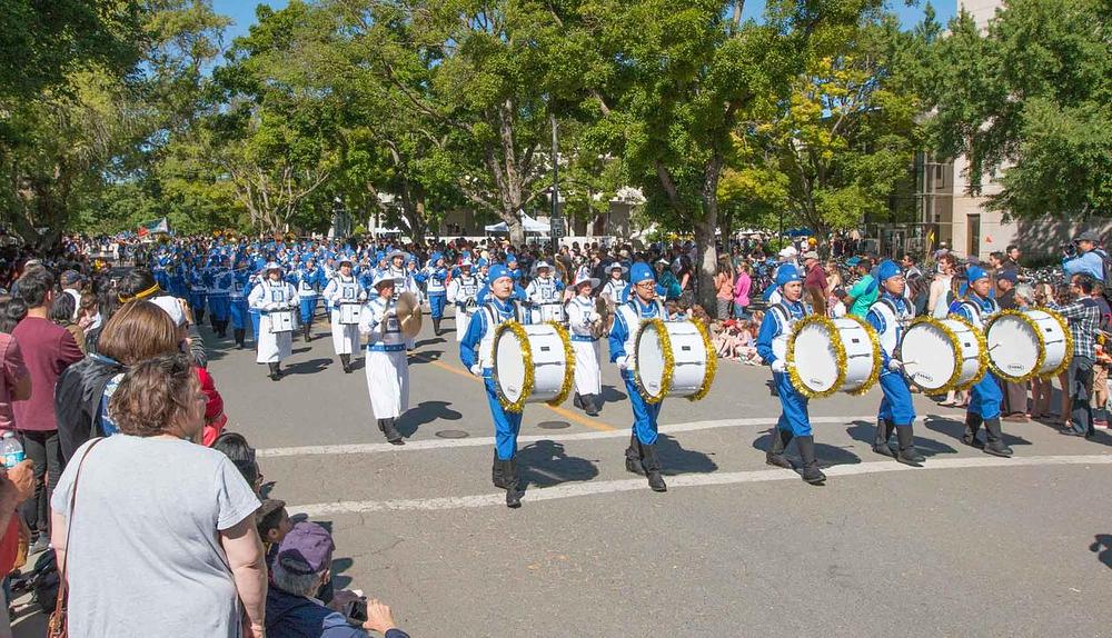 Falun Gong praktikanti, koji nastupaju u orkestru Divine Land Marching Band, su po četvrti puta uzeli učešće na 102. paradi prazničkog dana održanoj u kampusu kalifornijskog univerziteta Davis, 16. aprila 2016. godine.