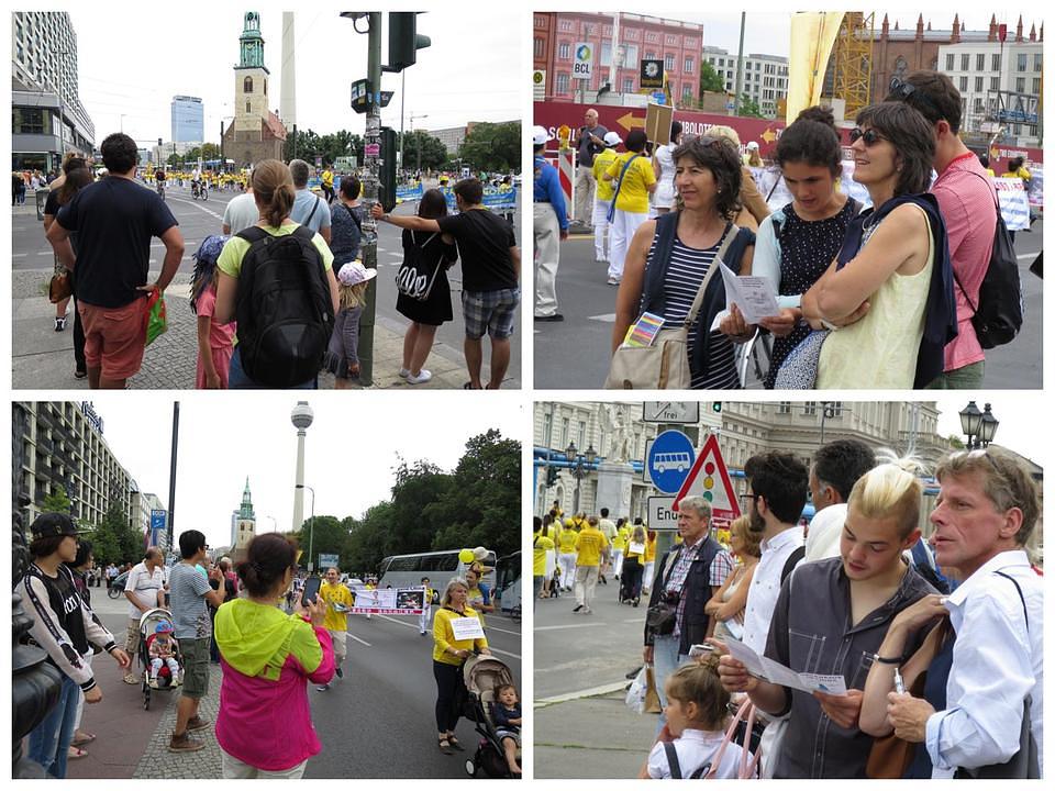 Nekoliko se stotina Falun Gong praktikanata okupilo 30. jula 2016. godine u Berlinu u Njemačkoj kako bi marširali i održali skup u znak protivljenja progonu u Kini. Učesnici su bili iz Njemačke i susjednih zemalja. Mnogi su gledaoci izrazili svoju podršku naporima praktikanta da se progon okonča.
