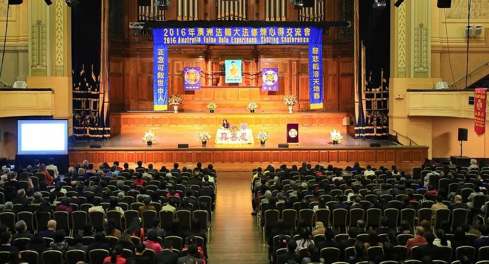 Skoro je 1.000 praktikanata prisustvovalo godišnjoj Australijskoj Falun Dafa konferenciji za razmjenu iskustava za 2016. godinu u Gradskoj dvorani u Melburnu 4. septembra 2016. godine. Dvadeset tri praktikanta iz Kine i sa zapada su na govornici govorili koliko su imali koristi od prakticiranja Falun Dafa, kako gledaju unutar sebe da bi se poboljšali, i kako skupa rade da ispune svoje istoriske zavjete.