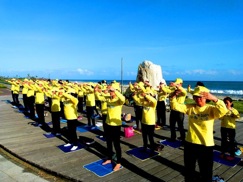 Praktikanti Falun Gonga sa istoka Tajvana su se okupili u parku na morskoj obali u Taitungu kako bi povodom Lunarne Nove Godine pripremili čestitku Učitelju Liju.