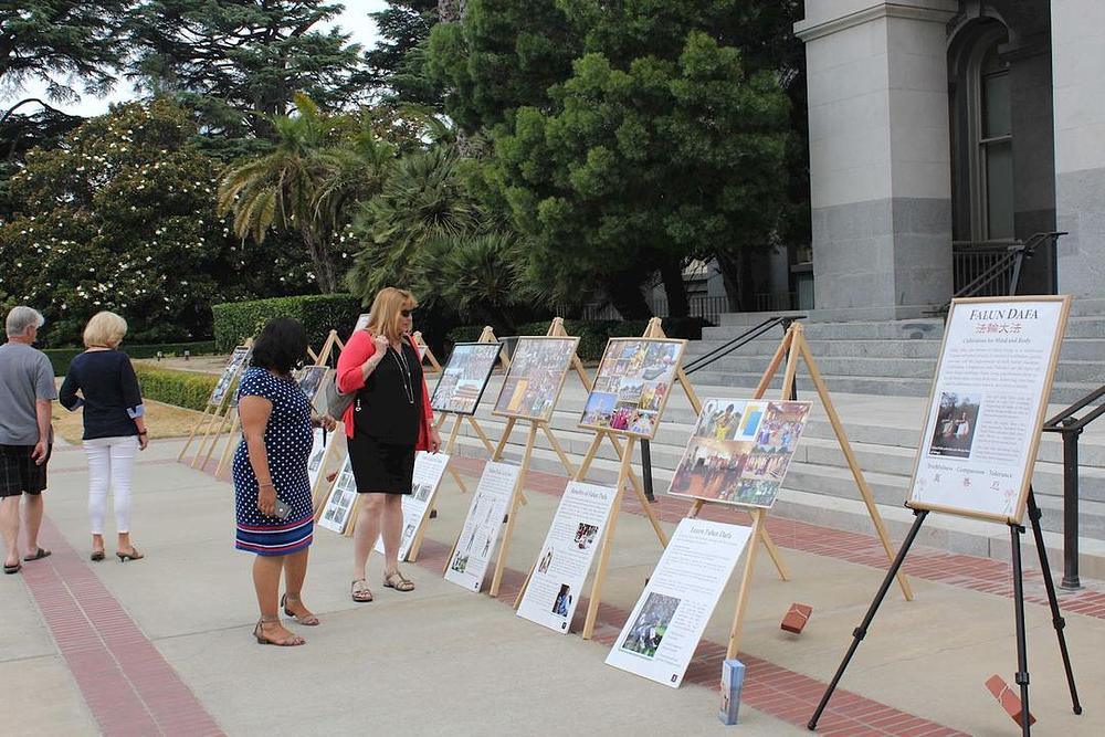 Praktikanti Falun Gonga su postavili informativne postere i ručno rađene lotosove cvjetove ispred 'California State Capitola' u Sacramentu 7. juna 2017. godine kako bi prolaznicima predstavili Falun Dafa praksu kultivacije.