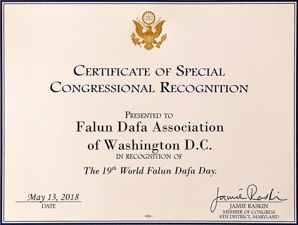 Jamie Raskin i John K. Delaney, dvojica članova kongresa iz Merylenda, su izdali proglas povodom 19. Svjetskog Falun Dafa dana. Zastupnik Delaney je napisao: "Vaš cilj promoviranja sretnijeg, zdravijeg i altruističnijeg stila života, kroz vrijednosti Zhen, Shan i Ren, je dopro do više od 100 miliona ljudi u preko 70 zemalja. Pohvaljujem vas zato što nastavljate promovisati ove vrijednosti kao i istoriju tradicionalne kineske kulture. Čestitamo!"