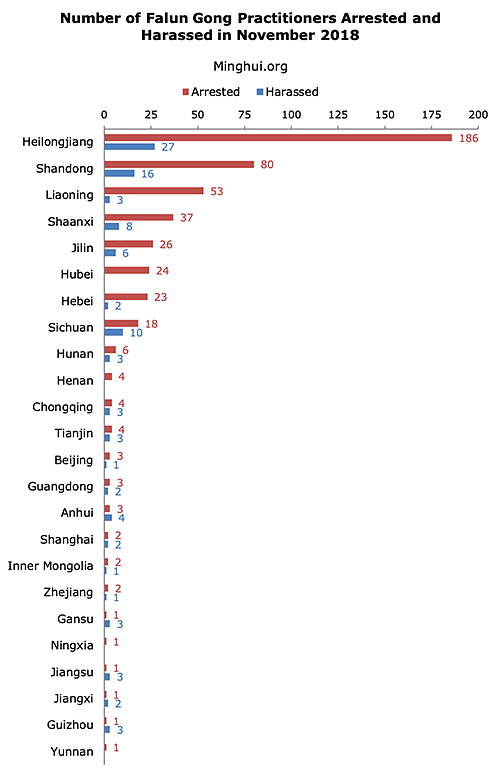 Prema podacima dostupnim našem portalu, u novembru 2018. godine je u Kini zabilježeno 486 slučajeva hapšenja praktikanata Falun Gonga, a dodatnih103 praktikanta su maltretirali zbog njihove vjere.