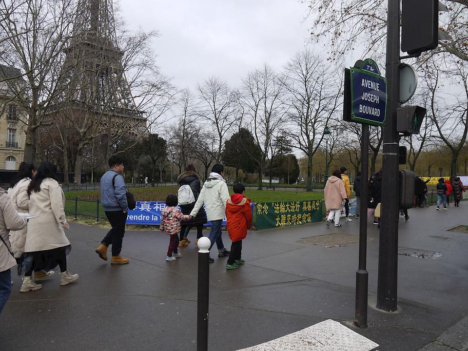 Kada kineski državljani putuju u inostranstvo na odmor, očekuju da ondje steknu uvid i iskuse druge kulture. Mnogima od njih, putovanje u inostranstvo daje i rijetku priliku da steknu neke vrijedne uvide i u vlastitu kulturu. Praktikanti Falun Gonga održavaju svoje prisustvo u blizini Eiffelovog tornja, pružajući ondje posjetiocima iz Kine necenzurirane informacije o Falun Gongu i progonu, informacije koje im propaganda kineskog režima uskraćuje. Suprotno stavu Komunističke partije Kine, kineski turisti u Parizu nauče da je Falun Gong tradicionalna kineska praksa kultivacije uma i tijela koja se zasniva na principima Istinitosti, Dobrodušnosti i Tolerancije.