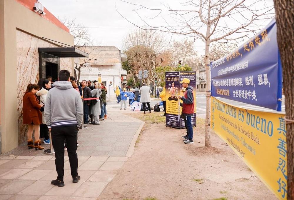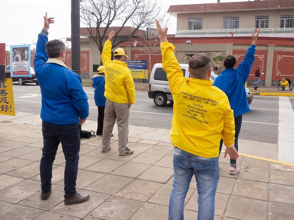 Falun Gong praktikanti iz Argentine okupili su se ispred kineskog veleposlanstva 18. srpnja 2019. godine, kako bi pozvali na okončanje progona. Neki praktikanti su pokazivali vježbe ili držali transparente, dok su drugi dijelili letke i razgovarali o progonu s prolaznicima.