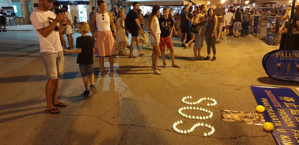 Kad je pala večer praktikanti su postavili štand za bdijenje uz svijeće, oblikujući svijećama znak SOS, uz poziv da se zaustavi progon i žetva organa od praktikanata u Kini. To je privuklo brojne turiste koji su promatrali praktikante, raspitivali se o praksi, slikali, čitali plakate i transparente te uzimali letke.