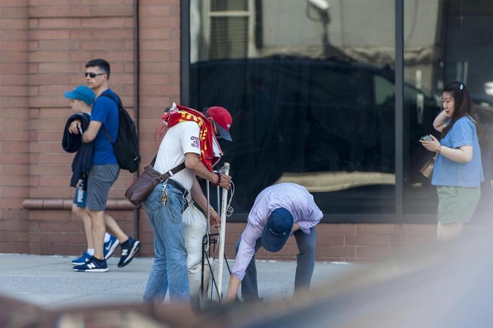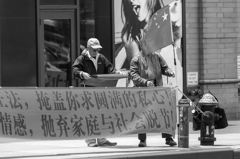 Dva muškarca, Kineza, redovno dolaze ovamo od maja 2015. godine kako bi maltretirali i napadali praktikante Falun Gonga. Svakog radnog dana, od 8:30 do 13:00 časova, postavljaju zastavu KPK i transparente na kojima se kleveće Falun Gong. Zatim se vraćaju u Meizhong Huaren Fuwu Gongsi (Američko-kineski centar za usluge) u Flushingu da vrate kolica, transparente i zastavu.